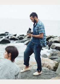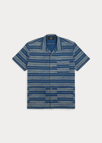 Made with cotton jersey that is dyed with true indigo. Discharge-printed with horizontal stripes. Pattern and color based on a vintage swatch. Corozo buttons. DETAILS - Size medium has a 27.5" body length, a 19.25" shoulder, and a 47" chest. - Camp collar. Buttoned placket. Corozo buttons. - Short sleeves. - Left chest patch pocket. Two front waist patch pockets. - Straight hem. - 100% cotton. - Machine washable. - Imported. - Dyed with true indigo, which may rub off onto fabrics, leather, and upholstery. - Style Number: 100047735