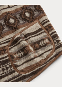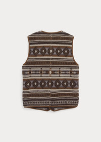 Made with jacquard low-pile fleece. Geometric pattern. Tape binding throughout. DETAILS - Size medium has a 25" front body length, a 24" back body length, a 15.75" shoulder, and a 41" chest. - V-neck. Snapped placket. - Cotton tape binding throughout. - Two front waist snapped pockets. - Cotton tape binding at hem. - Shell: 85% polyester, 15% wool. Binding: 100% cotton. - Dry clean. - Imported. Style Number: 648436