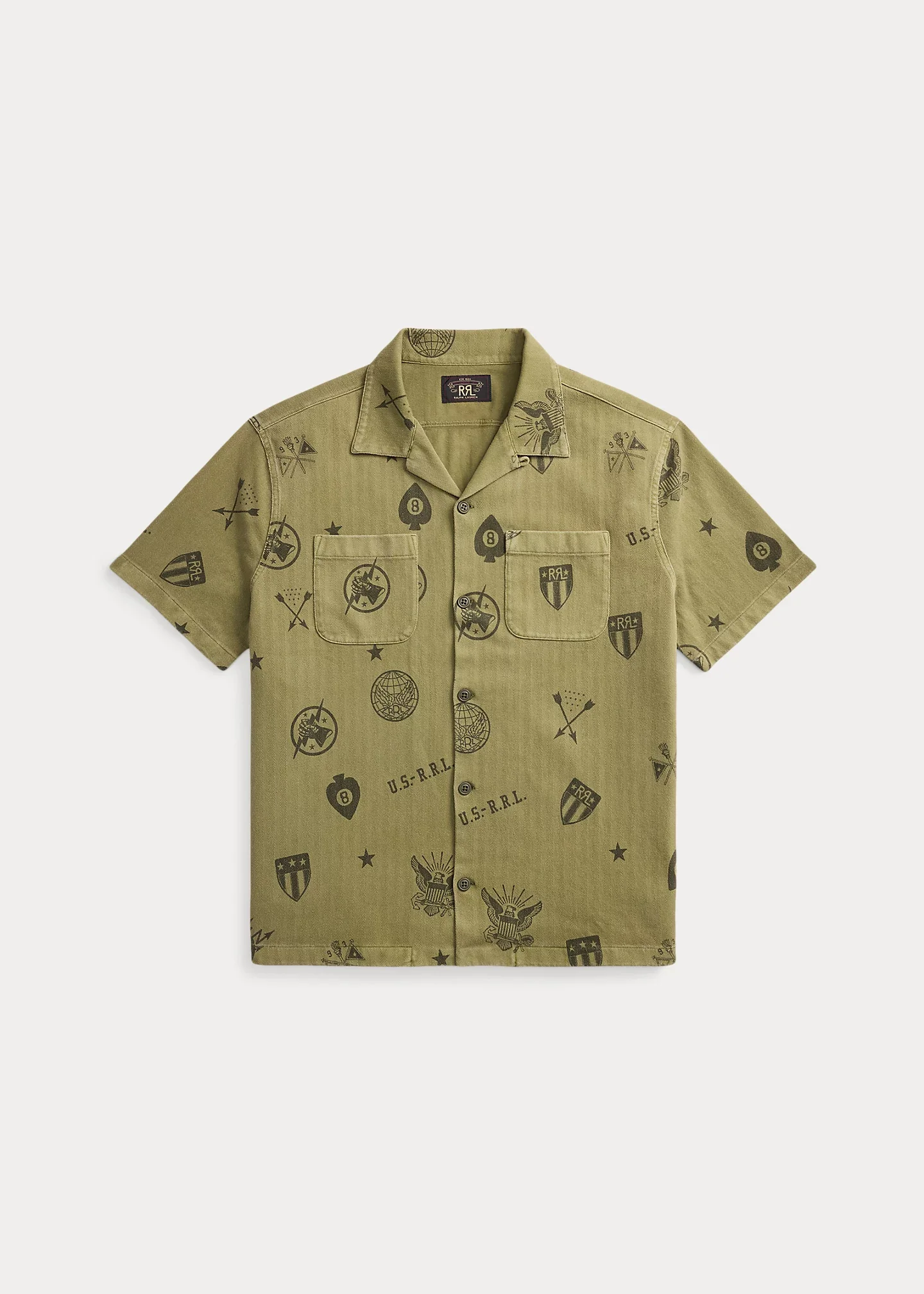 Camp shirt model made with a lightweight knit interpretation of herringbone twill. Printed motif features signature graphics inspired by vintage hand-stenciled art. DETAILS - Size medium has a 27.75" body length, a 19.25" shoulder, and a 47" chest. - Camp collar. Buttoned placket. - Short sleeves. - Two chest patch pockets. - “U.S.-R.R.L.,” “RRL” shield, and signature graphics printed throughout. - Straight hem. - 100% cotton. - Machine washable. - Imported. - Style Number: 100085528