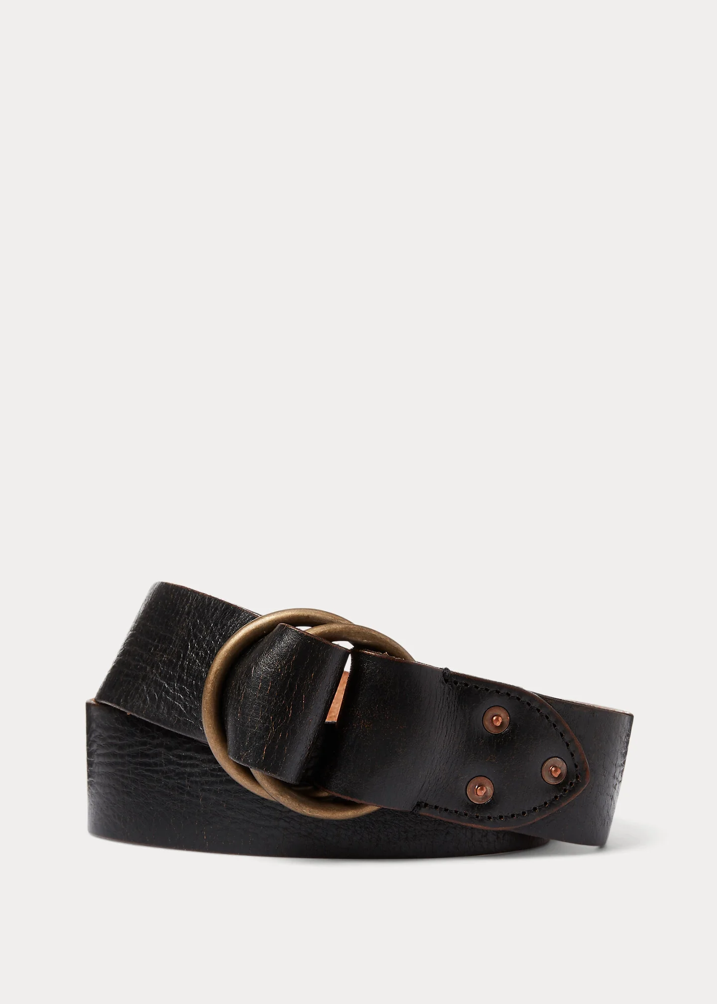 Made in Italy from vegetable-tanned leather that is hand-dyed to achieve a black-over-brown effect. Double–O-ring brass buckle with an unlacquered finish. Corroded copper-tone brass rivets at the strap. DETAILS - 1.5" wide. - Double-O-ring brass buckle. - Slightly pointed tip. - Leather. - Made in Italy. Style Number: 634632