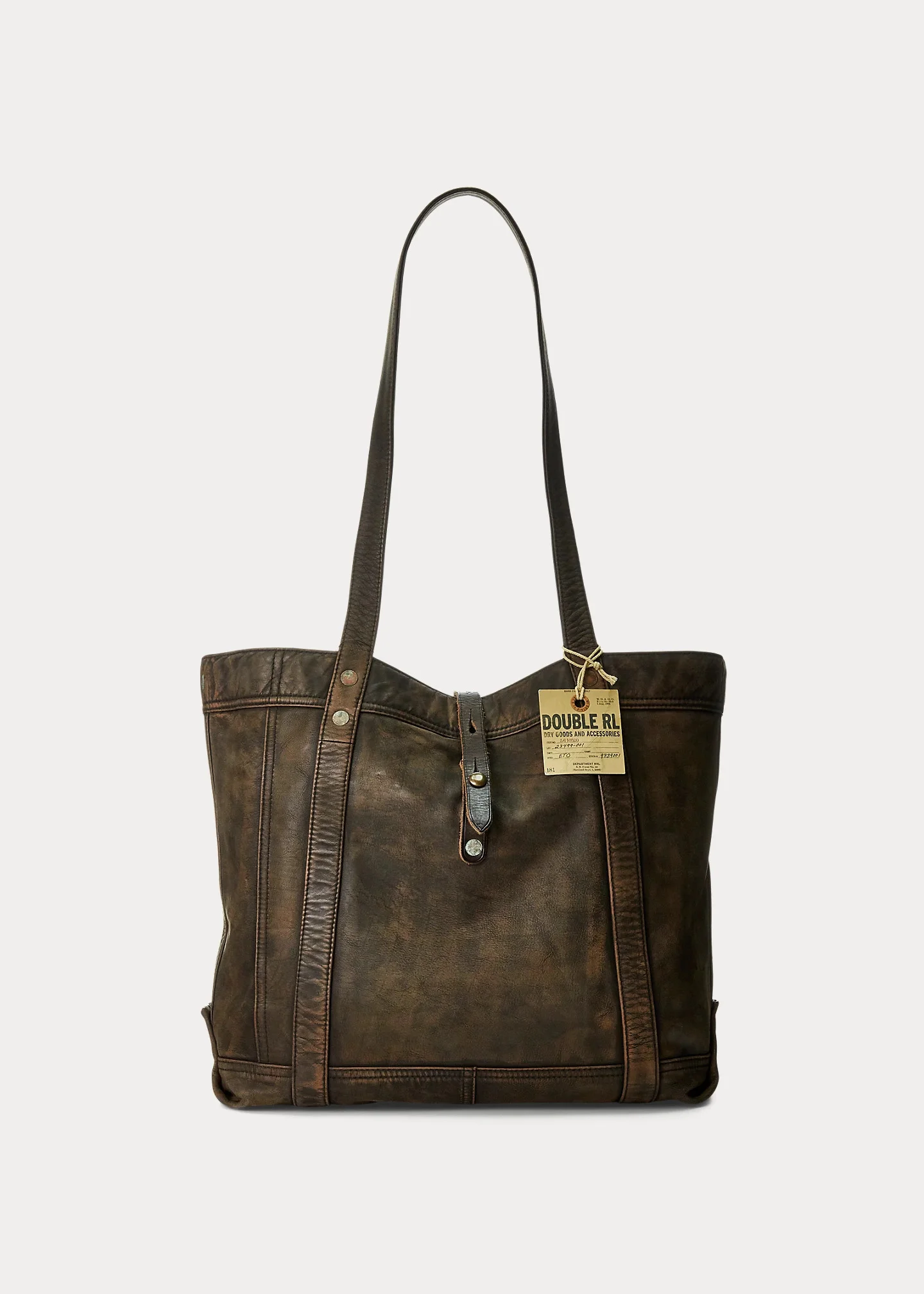 Made from lightweight, supple buffalo hide. Vegetable-tanned cow leather trim. Specially hand-finished for a timeworn look. Fully lined with cotton canvas. Brass hardware and distressed copper-tone rivets. DETAILS - Two leather top handles, each with a 12" drop. - Fold-over leather strap at the top fastens with a stud closure. Brass hardware. - One zip pocket at the interior. - Reinforced base. Distressed copper-tone rivets. - Fully lined with canvas. - 13" H x 18" L x 6" D. - Shell and trim: leather. Lining: cotton. - Imported. Style Number: 615083