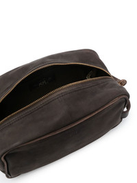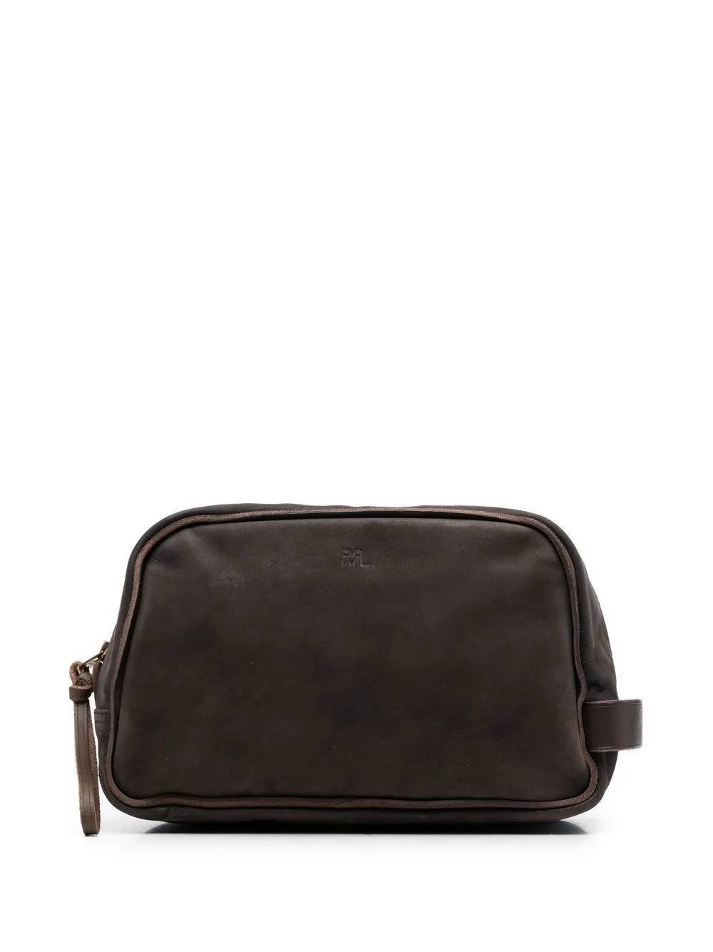 leather travel wash bag brown calf leather single flat side handle top zip fastening with branded zip puller debossed logo to the front internal patch pockets canvas lining Imported Composition Outer: Calf Leather 100% SIZE & FIT Measurement DEPTH 4.72 in(12 cm) HEIGHT 6.88 in(17.5 cm) WIDTH 11.02 in(28 cm)