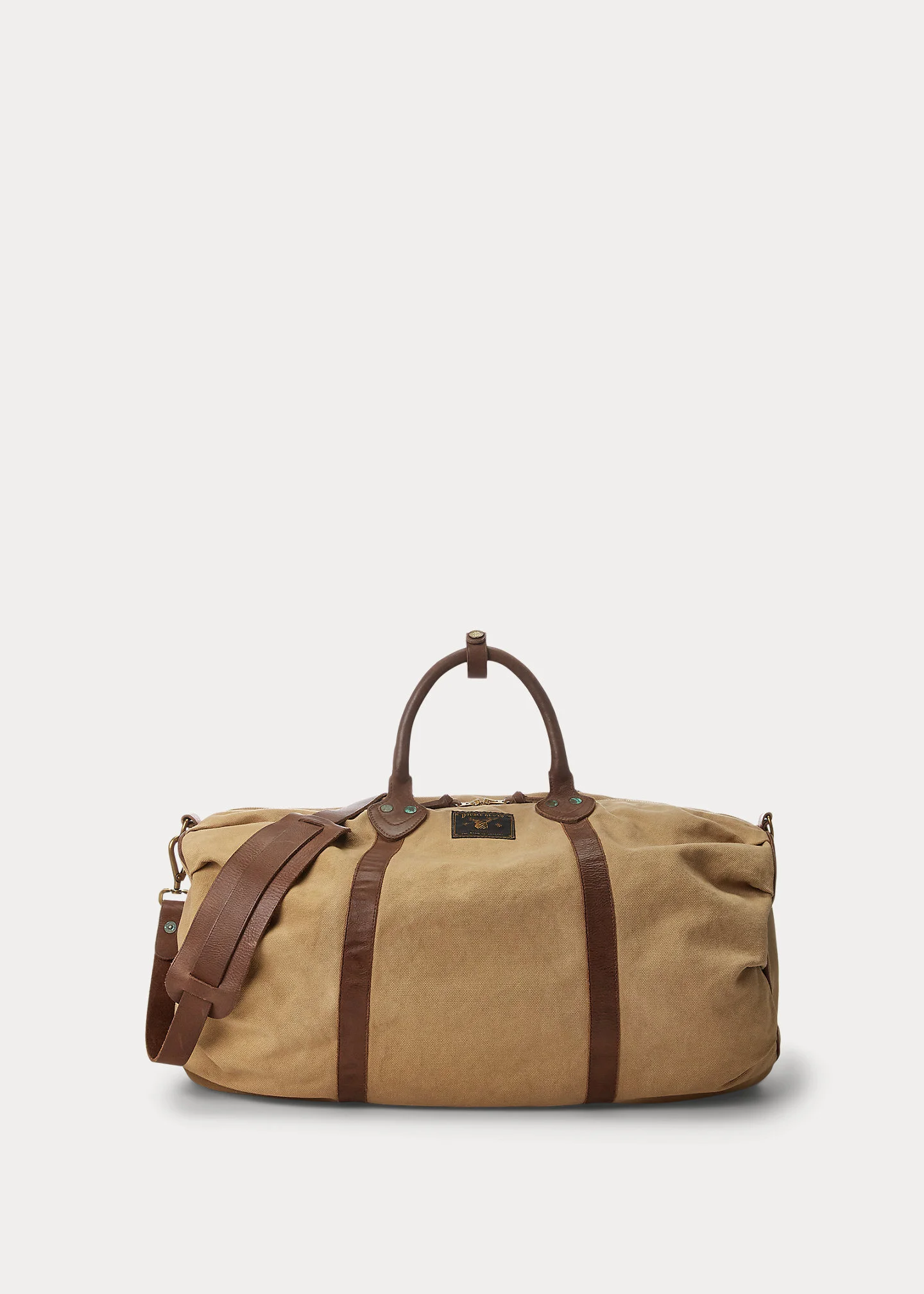 Made with durable cotton canvas. Full-grain leather handles, removable shoulder strap, and trim. Woven logo label with a deer graphic at the front. Brass hardware with a vintage-inspired finish. Distressed copper-tone rivets. DETAILS - Two leather top handles, each with a 4" drop. Removable, adjustable buckled leather shoulder strap with a 23" drop. - Two-way top zip closure with leather zipper pulls. - Interior slip pocket. - Leather trim. Distressed copper-tone rivets. - “Double RL & Co. Great Western Company” deer label at the front. - Unlined. - 9.5" H x 23" W x 9" D. - Shell: cotton. Trim: leather. - Imported. Style Number: 659234