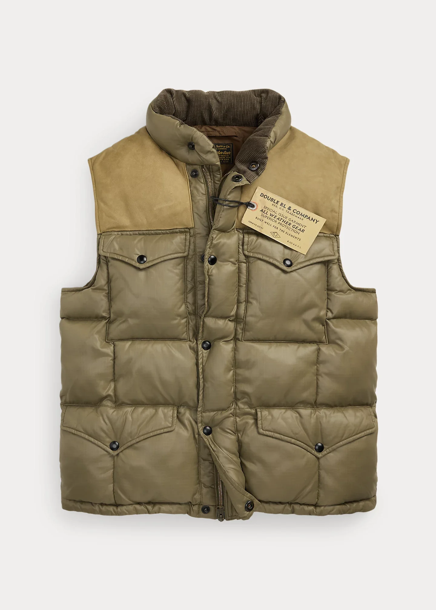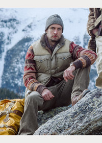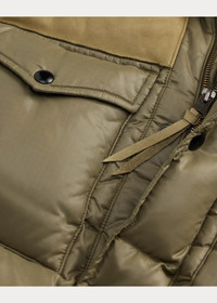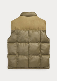 Box-quilted vest made from pigment-coated ripstop. Leather front and back yokes. Corduroy facing at the collar. Drawstring hem with a leather stopper. Insulated with a down-alternative fill. Brushed chamois pocket lining. DETAILS - Size medium has a 27” front body length, a 25.25” back body length, a 16.75” shoulder, and a 46” chest. - Mockneck with corduroy facing. Leather front and back yokes. Full-zip front with a leather zipper pull. Snapped storm placket. - Two chest snapped pockets. Two front waist snapped pockets. Two interior waist pockets. - Drawstring hem with a leather stopper. Fully lined and filled. - This product is made with recycled polyester. - Shell: 100% nylon. Yokes: 100% cow leather. Collar facing: 100% cotton. Lining and fill: 100% polyester (recycled). - Dry clean by a leather specialist. - Imported. - Style Number: 100062163