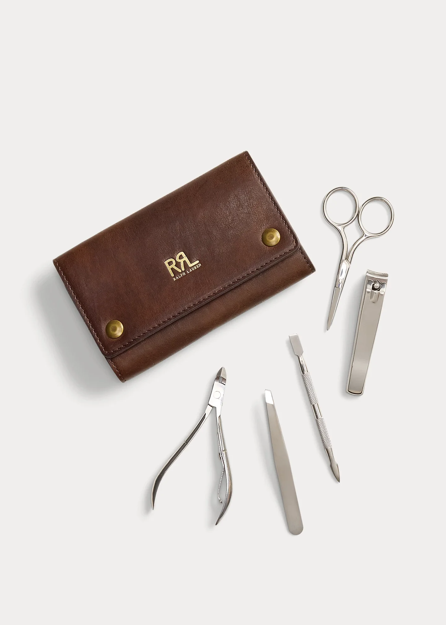 Nail grooming kit comes with scissors, tweezers, a nail pick, nail clippers, and cuticle cutters. Case is made with lightweight, supple leather that is specially developed for a timeworn effect. Double RL Ranch logo foil-printed at the front of the case. Stainless steel tools secure with leather loops at the interior. Antiqued-brass snaps. DETAILS - Comes with scissors, tweezers, a nail pick, nail clippers, and cuticle cutters. - Fold-over flap at the front fastens with two antiqued-brass snaps. - Double RL Ranch logo and “Ralph Lauren” foil-printed at the front. - Leather loops at the interior. - Self-lined. - 3.5" H x 5.5" L. 9.75" length when open. - Tools: 100% stainless steel. Case: 100% leather. - Ensure that any spill is wiped off leather immediately. For harder to remove stains, we recommend professional cleaning by a leather specialist. Imported. - Comes in a signature box. - Style Number: 100066820