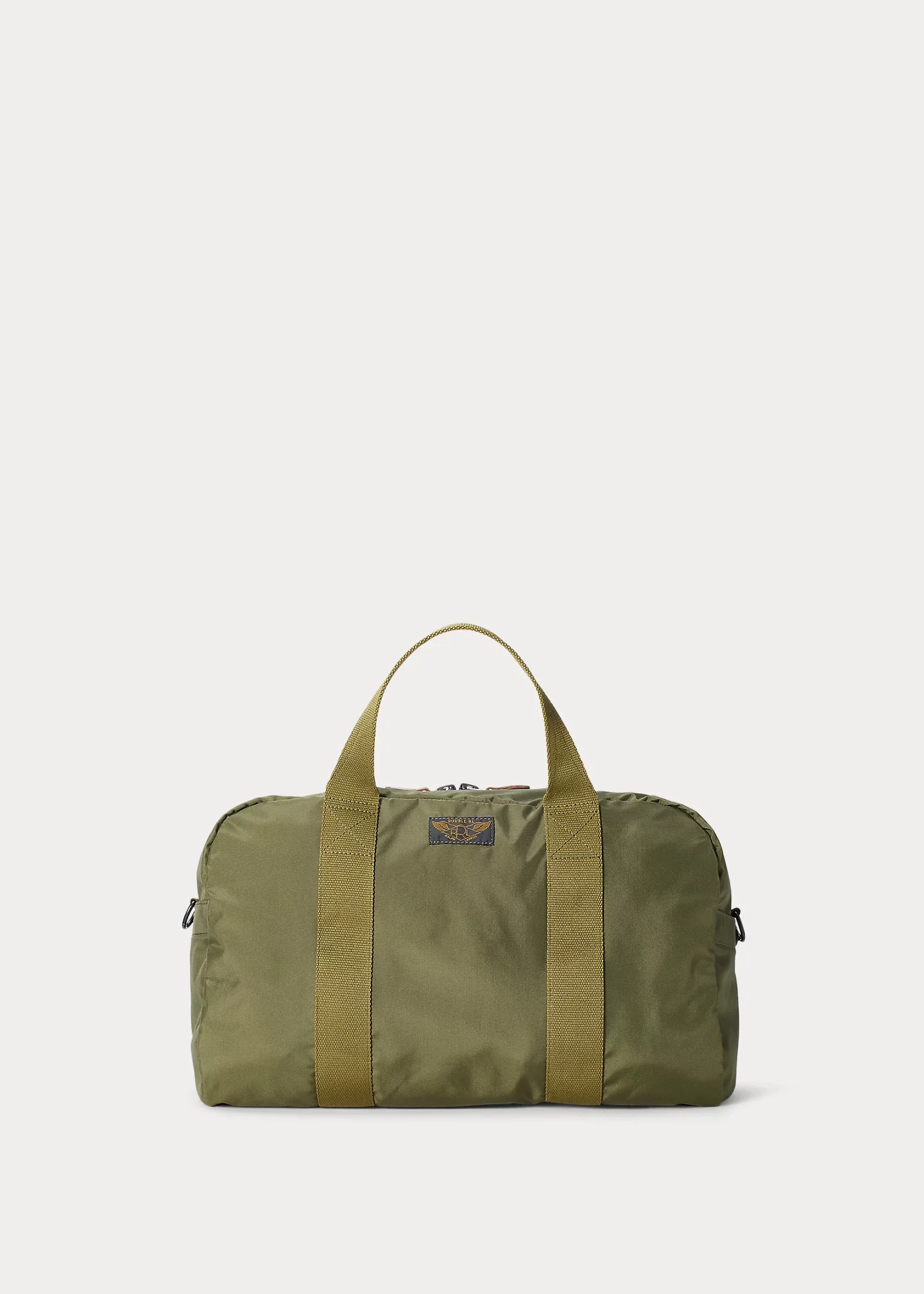 Constructed from durable, yet lightweight recycled nylon canvas. Inspired by mid-century surplus bags. Webbed top handles and removable shoulder strap. Self-lined. Leather zipper pulls. Solid brass hardware with a black oxidized finish. DETAILS - Two webbed top handles, each with a 6" drop. Removable, adjustable webbed shoulder strap with a 24" drop. - Two-way top zip closure with a leather zipper pull. - Snapped pocket at each side. One zip pocket and one slip pocket at the interior. - "RRL" winged-logo patch at the front. - Self-lined. - 11" H x 17" L x 9" D. - Shell and lining: Made with recycled nylon, which helps reduce the impact of this product by avoiding the use of virgin nylon, a petroleum-based material. - Visit corporate.RalphLauren.com/citizenship-create-timeless-style for more information on Ralph Lauren's sustainability initiatives. - Shell and lining: 100% recycled nylon. Trim: 100% leather. Webbing: 100% polyester. Imported. Style Number: 607952