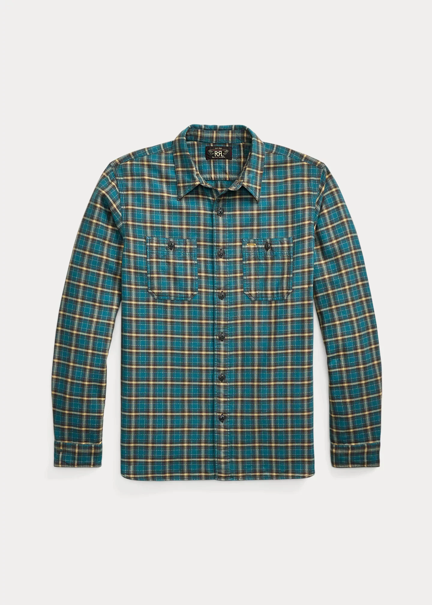 Made with yarn-dyed plaid cotton twill. Detailing inspired by 1940s workwear. Authentic runoff chain-stitched construction at the side seams, which is based on workshirts from the 1920s and ’30s. DETAILS - Workshirt Fit: Double RL’s slightly more relaxed fit with more ease through the body and sleeves. - Size medium has a 30" back body length, an 18.25" shoulder, a 43.5" chest, and a 34.75" sleeve length. Sleeve length is taken from the center back of the neck. - Straight collar. Buttoned placket. - Long sleeves with buttoned barrel cuffs. - Two chest buttoned pockets. - Authentic runoff chain-stitched construction at the side seams. - 100% cotton. - Machine washable. - Imported. - Style Number: 100058615