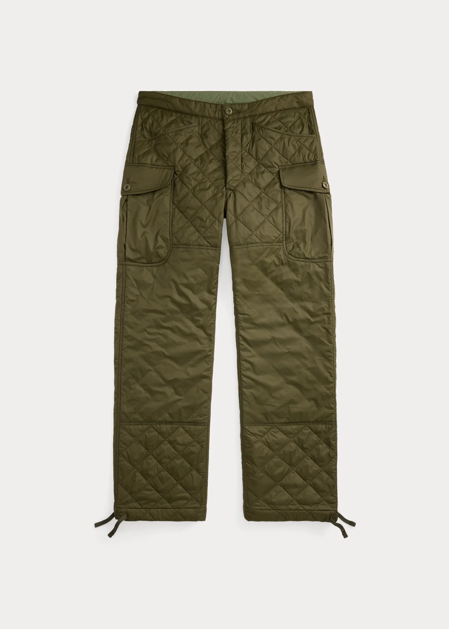 Olive-hued cargo pants. Lightweight diamond-quilted construction. Interior drawstring waist and hems. Button fly. Reinforced knees and seat. DETAILS - Size 32W has a 10.5" rise and a 19.25" leg opening. - Belt loops. Button fly with a buttoned closure. Interior drawstring. - Two front angled pockets. Cargo pocket at each leg. - Reinforcements at the knees and seat. - Drawstring hems. - Fully lined and filled. - Shell and lining: 100% nylon. Fill: 100% polyester. - Imported. - Style Number: 100059631