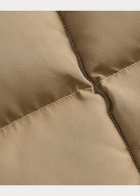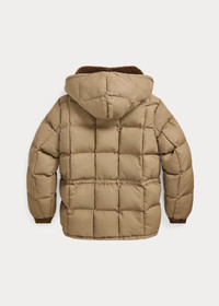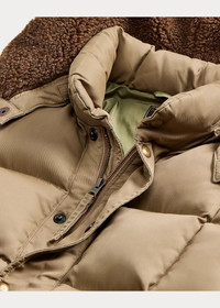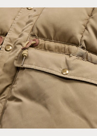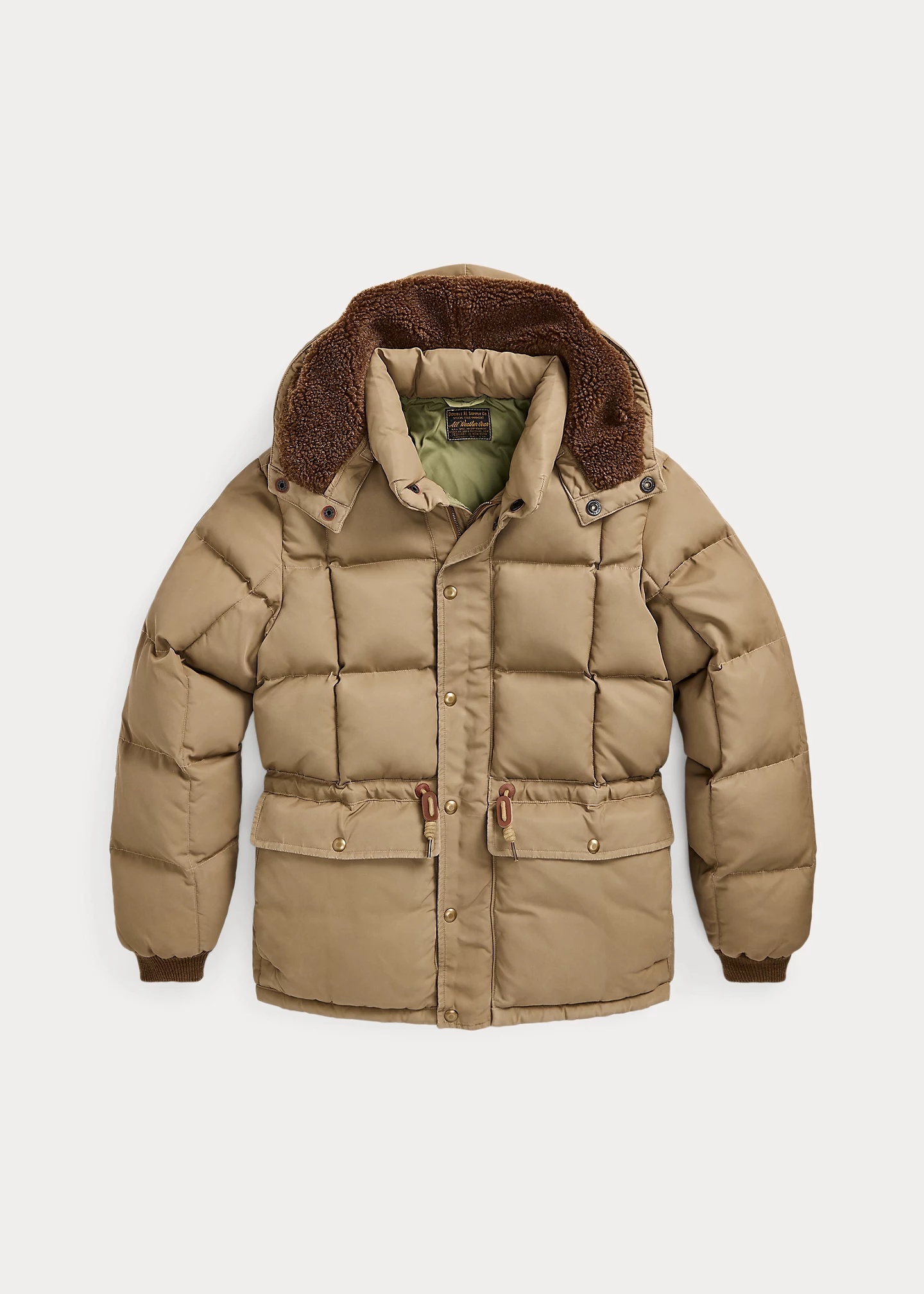 Inspired by mountaineering and expedition outerwear from the ’60s. Made with pigment-coated twill. Removable hood is lined with faux-shearling. Fully lined and insulated with a down-alternative fill. Ribbed cuffs. Brushed chamois lining at the hand-warmer pockets. Leather stoppers at the drawstring hood, waist, and hem. DETAILS - Size medium has a 29" body length (front and back), a 19.75" shoulder, a 49" chest, and a 36.25" sleeve length. Sleeve length is taken from the center back of the neck and changes 1" between sizes. - Mockneck. Button-off drawstring hood with faux-shearling lining. Leather stoppers. Full-zip front. Snapped storm placket. Signature snaps. - Long sleeves with ribbed cuffs. - Two hand-warmer pockets. Two front waist snapped pockets. Two interior waist pockets. - Drawstring waist. Interior drawstring hem. Fully lined and filled. - Shell: 100% polyamide. Ribbed cuffs: 75% cotton, 25% polyester. Hood lining: 95% polyester, 5% acrylic. Body lining and fill: 100% polyester. - Dry clean by a leather specialist. - Imported. - Style Number: 100027343