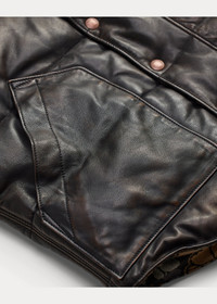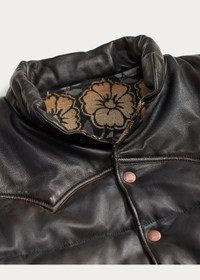 Lightweight, supple leather vest is channel-quilted and features Western-style yokes. Reverses to floral cotton jacquard fabric. Brushed chamois pocket bags. Etched brass snaps. DETAILS - Size medium has a 27" front body length, a 26" back body length, a 16.75" shoulder, and a 46" chest. - Leather mockneck. Snapped placket. Etched brass snaps. - Shell: Western-style front and back yokes; two front waist patch pockets. - Reverse: two front waist angled pockets. - Brushed chamois pocket bags. Fully filled. - Shell: 100% sheep leather. Reverse: 100% cotton. Fill: 100% polyester. - Dry clean by a leather specialist. - Imported. - Due to the natural characteristics of this material, the coloring may rub off onto fabrics and upholstery. - Style Number: 100082445