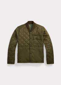 Reversible liner jacket. Olive-hued shell is quilted at the top half. Sage-hued reverse is fully quilted with tonal herringbone taping. Ribbed baseball collar. Lightweight diamond-quilted construction. Chamois lining at the waist pockets. DETAILS - Size medium has a 27" front body length, a 26.25" back body length, an 18" shoulder, a 45" chest, and a 35" sleeve length. Sleeve length is taken from the center back of the neck. - Ribbed baseball collar. Snapped placket. - Long sleeves with elasticized binding at the cuffs. - Shell: left chest snapped pocket; two front waist angled pockets. Reverse: two front waist angled pockets. - Herringbone taping throughout the reverse. - Fully filled. - Shell and reverse: 100% nylon. Fill: 100% polyester. Ribbed collar: 51% cotton, 49% wool. - Machine washable. - Imported. - Style Number: 100059630