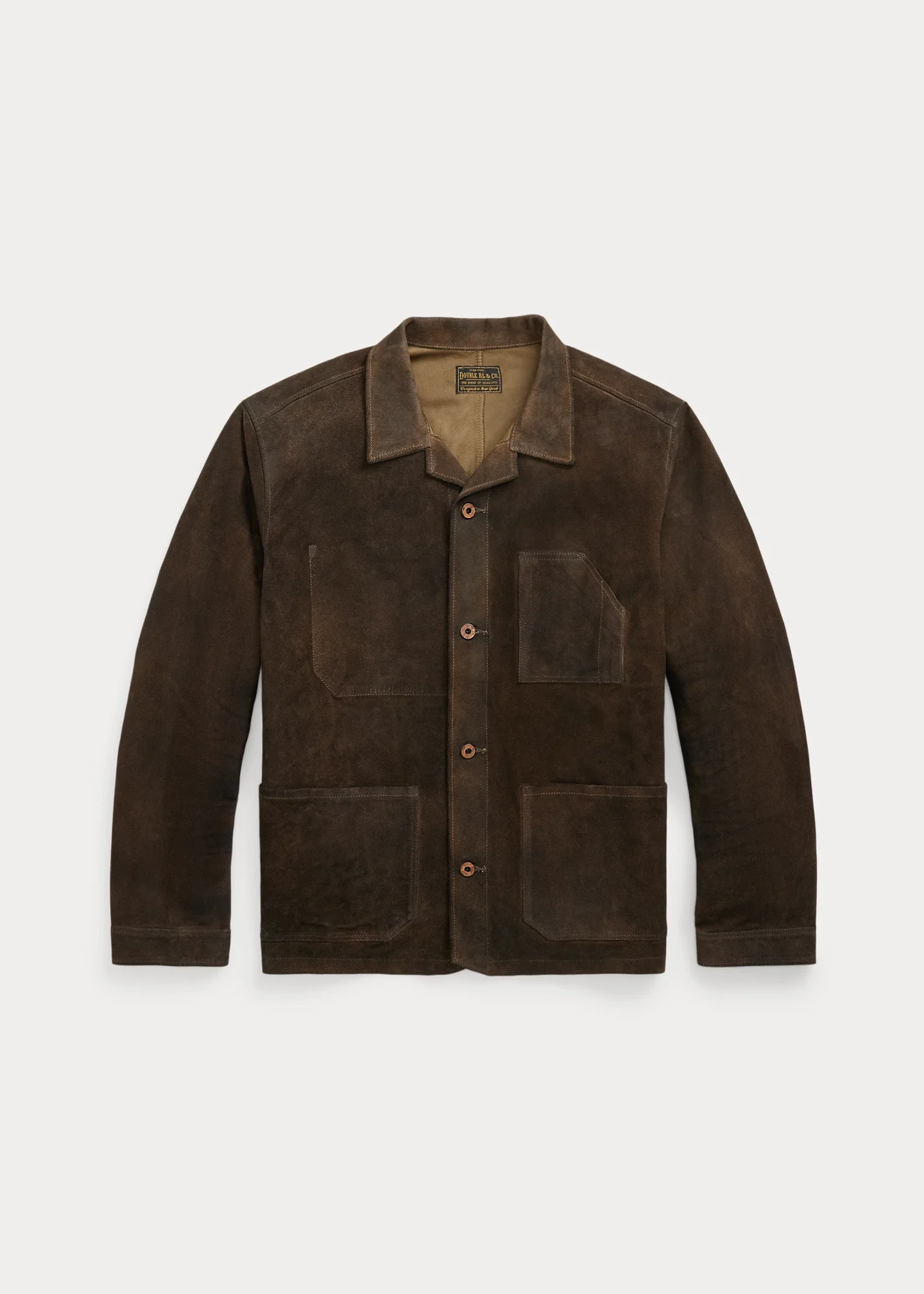 Made from waxed and burnished roughout suede. Inspired by vintage workwear jackets. Unconstructed. Cutaway front hem. Unlined. Distressed metal buttons. DETAILS - Size medium has a 27.75" back body length, a 19.75" shoulder, a 46.25" chest, and a 34.5" sleeve length. Sleeve length is taken from the center back of the neck. - Straight collar. Buttoned placket. Distressed metal buttons. - Long sleeves with buttoned barrel cuffs. - Left chest patch pocket. Two front waist patch pockets. Interior right chest pocket. - Unlined. - 100% cow suede. - Spot clean. - Imported. - Style Number: 100065294