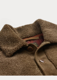 Made with roughout suede. Shearling collar and front body. Vintage- and varsity-inspired model. Tonal melange ribbed cuffs. Body is lined with yarn-dyed plaid cotton. Brushed chamois lining at the hand-warmer pockets. DETAILS - Size medium has a 25” front body length, a 23.25” back body length, a 43.5” chest, and a 35.25” sleeve length. Sleeve length is taken from the center back of the neck. - Shearling spread collar. Buttoned placket. Corozo buttons. - Long sleeves with ribbed cuffs. - Two hand-warmer pockets with brushed chamois lining. Interior left chest pocket. - Inverted box pleat at the center back. Adjustable buckled tabs at the back waist. - Fully lined. Body is lined with plaid brushed cotton. - Front body and collar: 100% dyed lamb shearling. Back body, sleeves, and undercollar: 100% suede. Ribbed cuffs: 77% cotton, 23% polyester. Body lining: 100% cotton. Sleeve lining: 100% polyester. - Spot clean. Imported. Shearling origin: Spain. - Due to the natural characteristics of this material, the coloring may rub off onto fabrics and upholstery. - Style Number: 100041977