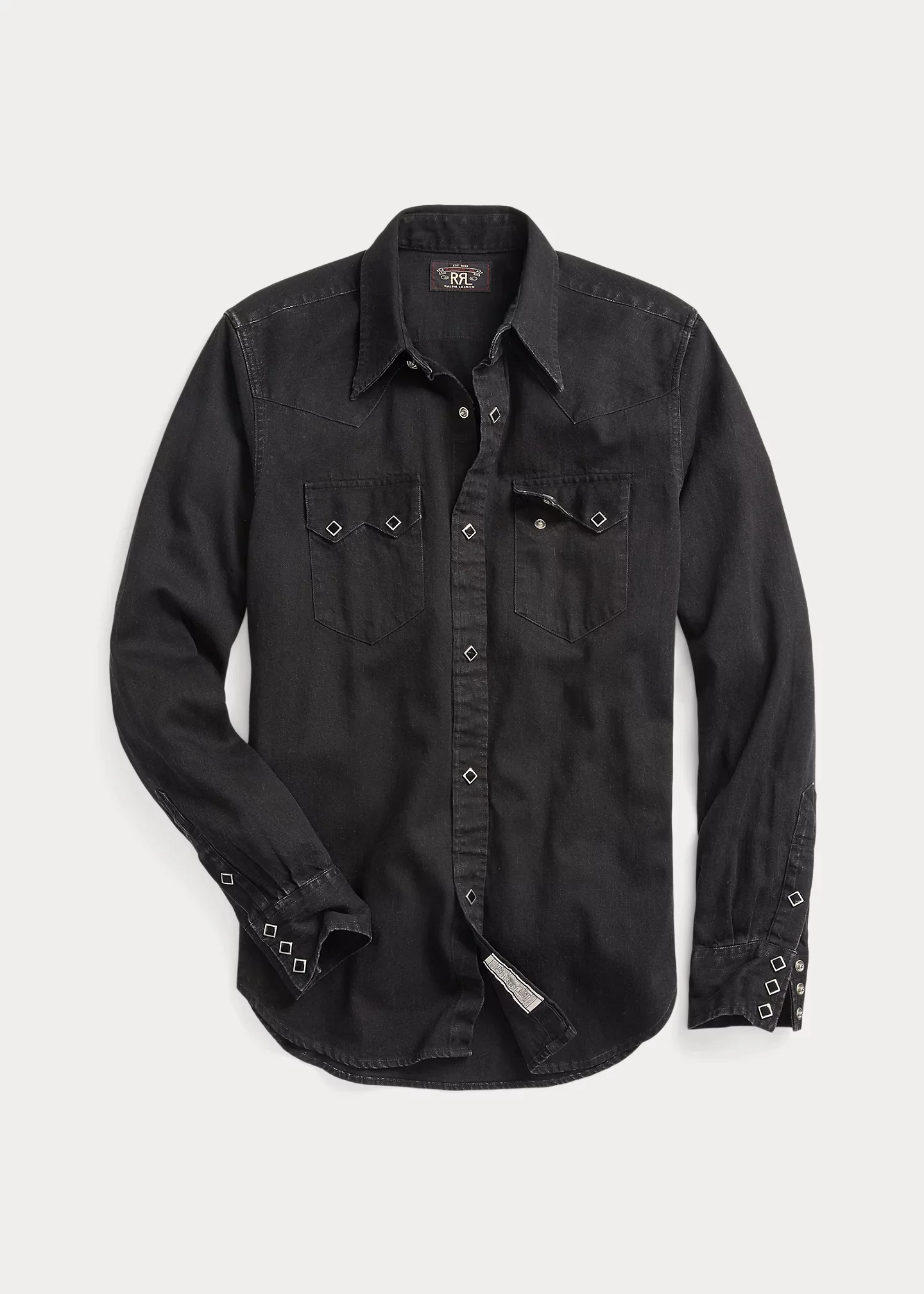 Slim-fitting shirt made with slub denim from Japan. Detailing inspired by 1950s Westernwear. Rinsed for tonal variation. Diamond-shaped snaps. DETAILS - Western Fit: Double RL’s slimmest shirt silhouette. Cut trim through the body and the sleeves. - Size medium has a 30" back body length, a 17.75" shoulder, a 42.75" chest, and a 34.75" sleeve length. Sleeve length is taken from the center back of the neck and changes 1" between sizes. - Point collar with a metal button at the front. Snapped placket. Western-style front and back yoke. - Long sleeves with snapped barrel cuffs. - Two chest snapped pockets. - 100% cotton. - Machine washable. - Imported. - Due to the natural characteristics of this material, the coloring may rub off onto fabrics and upholstery. Style Number: 648438