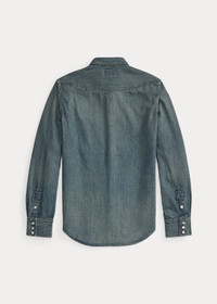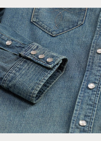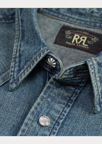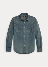Slim-fitting Western shirt made from Japanese indigo denim. Triple-needle chain-stitching throughout for durability. Finished with custom Japanese-made high-rim snaps. DETAILS - Western Fit: RRL’s slimmest shirt silhouette. Cut trim through the body and the sleeves. - Point collar with a metal button at the neck. Snapped placket. - Western-style front and back yoke. - Long sleeves with snapped barrel cuffs. - Two chest snapped pockets with boot-stitch embroidery. - 100% cotton. - Machine washable. - Imported. Style Number: 113231