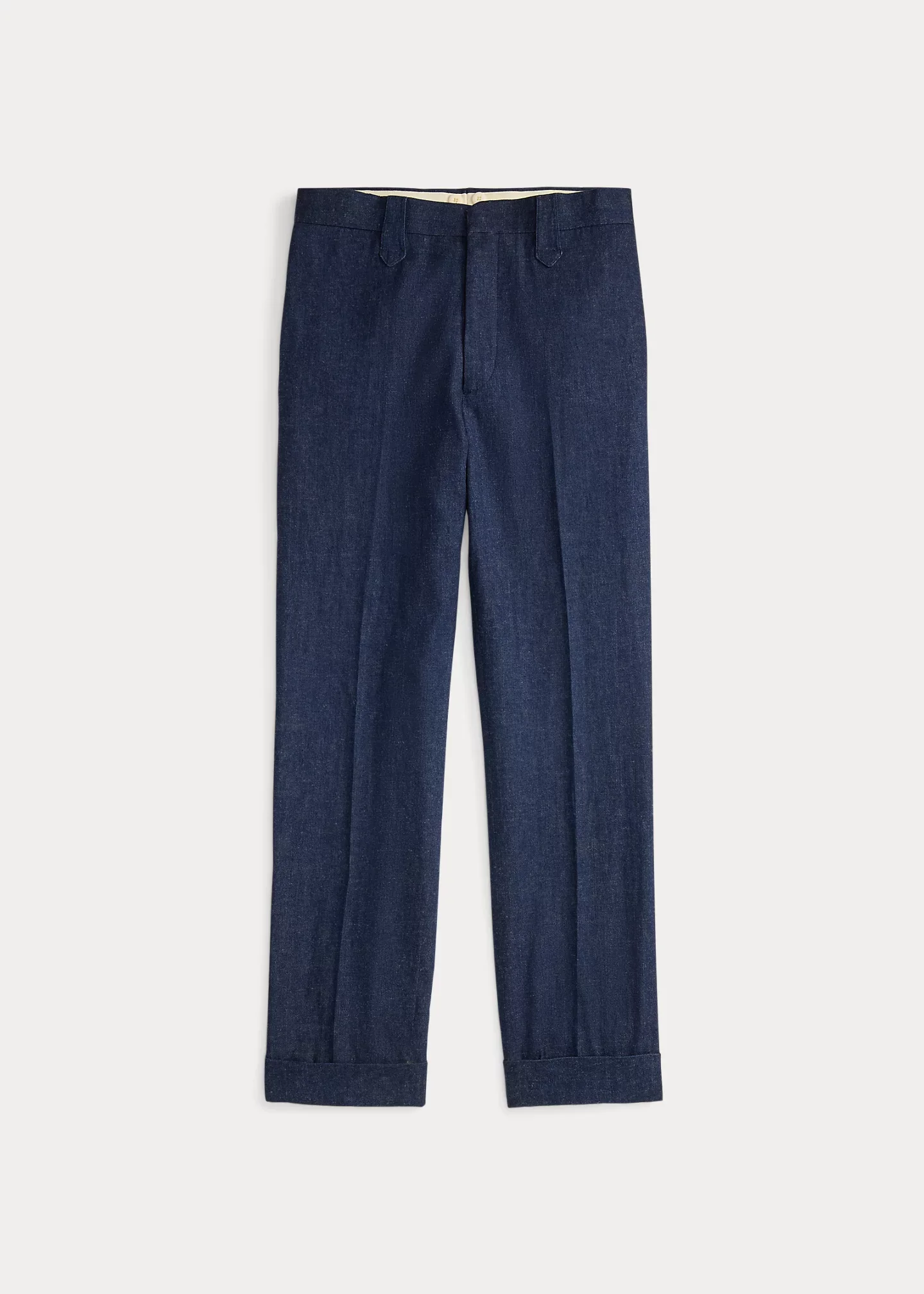 Slim-fitting suit trousers tailored in Italy. Indigo-dyed denim was custom-woven in Japan with cotton and linen. Western-style belt loops and pockets with triangular reinforcements. Half-lined. Genuine horn buttons. DETAILS - Slim fit. - Size 32W has a 10.25" rise and a 15.5" leg opening. - Western-style belt loops. Button fly with a buttoned closure. Genuine horn buttons. Curtain waistband. Interior buttons for braces. - Side on-seam pockets. Two back welt pockets with triangular reinforcements. - Lined to the knees. - Comes unhemmed with a 38" inseam. Alterations available in Ralph Lauren retail stores. - Shell: 85% cotton, 15% linen. Lining: 51% cotton, 49% viscose. - Dry clean. Made in Italy. - Model is 6'1" (185 cm) and wears a size 32W. - Style Number: 100081754