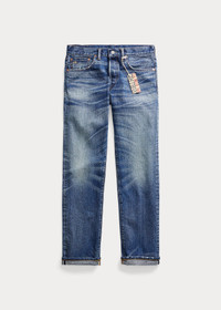 Made in America with Tennessee-grown cotton. Yarn is ring-spun and rope-dyed in Japan using true indigo. Woven on vintage shuttle looms in Japan to create custom 15.92 oz. right-hand twill. Selvedge construction inspired by ’30s denim. Hand-finished in a process that involves up to 50 individual steps using specialized tools and techniques. DETAILS - Slim Fit: a medium-low rise and a slim thigh and leg. - Size 32W has a 9" rise and a 14.5" leg opening. - Hand-set chain-stitched waistband with inserted belt loops for added durability. Button fly with our signature buttoned closure ensures a consistent fit through years of wear. - American-made buttons, rivets, and washer burrs. Five-pocket styling. "RRL" embroidery at the selvedge coin pocket. Twill pocket lining. - Leather "RRL"-debossed logo label at the back right waist. - Shell: 100% cotton. Patch: 100% leather. - Machine washable. For best results, wear 90 days without washing. - Made in USA with imported components. - Dyed with indigo, which may rub off onto fabrics, leather and upholstery. - Style Number: 538583