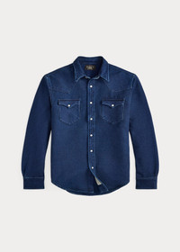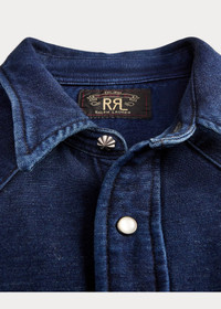 Made with heavyweight cotton chamois cloth. Yarn-dyed with indigo. Brushed finish. Pearlescent snaps. Metal button at the collar. Washed to achieve tonal dimension and an authentic timeworn effect. DETAILS - Western Fit: Double RL’s slimmest shirt silhouette. Cut trim through the body and the sleeves. - Size medium has a 29.75" back body length, an 18.75" shoulder, a 43.25" chest, and a 35" sleeve length. Sleeve length is taken from the center back of the neck. - Straight collar with a metal button at the front. Snapped placket. Western-style front and back yokes. - Long sleeves with snapped barrel cuffs. - Two chest snapped pockets. - 100% cotton. - Machine washable. - Imported. - Dyed with indigo, which may rub off onto fabrics, leather, and upholstery. - Style Number: 100067304