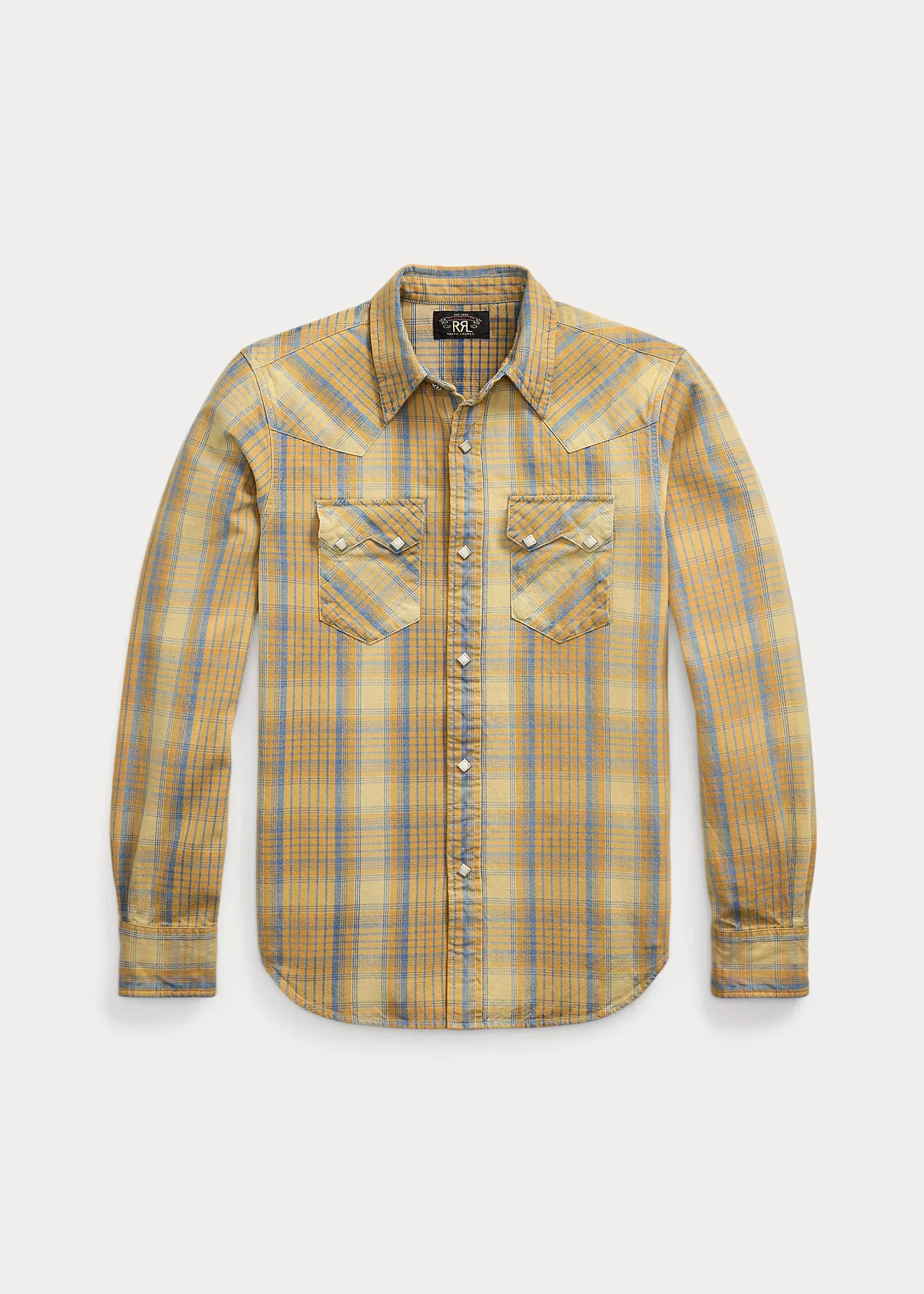 Slim-fitting shirt made with plaid cotton cloth. Yarn-dyed with true indigo. Detailing inspired by 1950s Westernwear. Metal button at the collar. Diamond-shaped snaps. DETAILS - Western Fit: Double RL’s slimmest shirt silhouette. Cut trim through the body and the sleeves. - Size medium has a 30" back body length, a 17.75" shoulder, a 43" chest, and a 34.75" sleeve length. Sleeve length is taken from the center back of the neck. - Straight collar with a metal button at the front. Snapped placket. Western-style front and back yokes. - Long sleeves with snapped barrel cuffs. - Two chest snapped pockets. - 100% cotton. - Machine washable. - Imported. - Dyed with true indigo, which may rub off onto fabrics, leather, and upholstery. - Style Number: 100058617