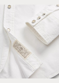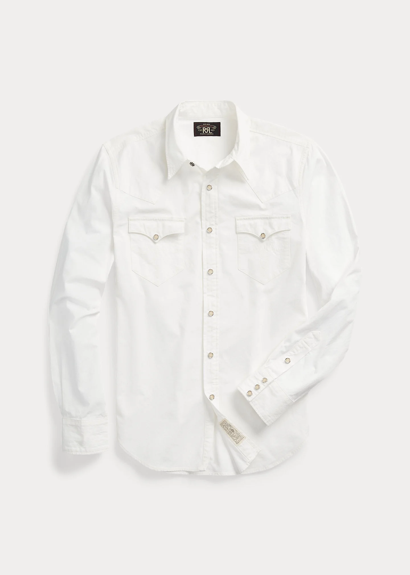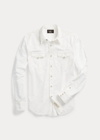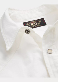 Slim-fitting Western shirt made with cotton poplin. Cloth features a dry, compact feel for a crisp texture. Metal button at the collar. Now available in extended XXS sizing. Sizes are based on Double RL men’s sizes. For customers who typically wear women’s apparel, we recommend ordering one size down from their usual size. DETAILS - Now available in extended XXS sizing. Sizes are based on Double RL men’s sizes. For customers who typically wear women’s apparel, we recommend ordering one size down from their usual size. - Western Fit: Double RL’s slimmest shirt silhouette. Cut trim through the body and the sleeves. - Size medium has a 30" back body length, a 17.75" shoulder, a 42.75" chest, and a 34.75" sleeve length. Sleeve length is taken from the center back of the neck and changes 1" between sizes. - Point collar with a metal button at the front. Snapped placket. Western-style front and back yoke. - Long sleeves with snapped barrel cuffs. - Two chest snapped pockets. - 100% cotton. - Machine washable. - Imported. Style Number: 648439