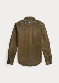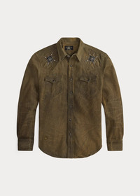 Slim-fitting shirt made from 9 oz. denim. Western-style front and back yokes with brass studs and leather piecing. Decorative stitching at the pockets. Wash is achieved using a heavy brown overdye process and irregular black resin dip method for dimensional color. DETAILS - Western Fit: Double RL’s slimmest shirt silhouette. Cut trim through the body and the sleeves. - Size medium has a 29.5" back body length, a 17.75" shoulder, a 44.5" chest, and a 34.75" sleeve length. Sleeve length is taken from the center back of the neck. - Straight collar with a metal button at the front. Snapped placket. Western-style front and back yokes. Brass studs and leather piecing at the yokes. - Long sleeves with snapped barrel cuffs. - Two chest snapped pockets. - 100% cotton (exclusive of decoration). - Machine washable. - Imported. - Coloring may rub off onto fabrics and upholstery. - Style Number: 100088444