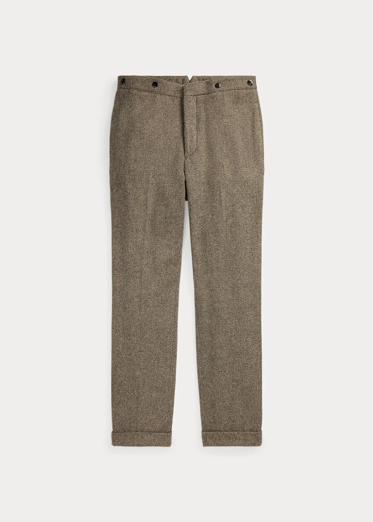 Slim-fitting trousers tailored in Italy. Fiber-dyed wool dobby cloth was custom-developed with an Italian mill. Half-lined. Genuine horn buttons. DETAILS - Slim fit. - Size 32W has a 10.25" rise and a 15.5" leg opening. - Belt loops. Button fly with a buttoned closure. Genuine horn buttons. Curtain waistband. Interior buttons for braces. - Side on-seam pockets. Right hip coin pocket. Two back buttoned pockets. - Lined to the knees. - Comes unhemmed with a 38" inseam. Alterations available in Ralph Lauren retail stores. - Shell: 100% wool. Lining: 51% cotton, 49% viscose. - Dry clean. Made in Italy. - Model is 6'1" (185 cm) and wears a size 32W. - Style Number: 100066917