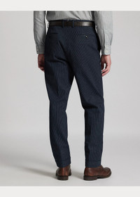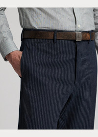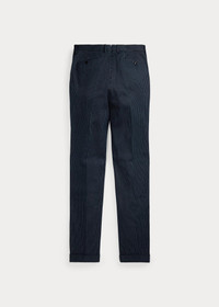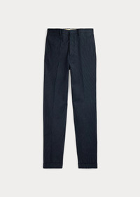 Slim-fitting trousers tailored in Italy. Striped cotton herringbone was custom-developed with a Japanese mill. Yarn-dyed with indigo. Genuine horn buttons. DETAILS - Slim fit. - Size 32W has a 10.25" rise and a 15.5" leg opening. - Belt loops. Button fly with a buttoned closure. Genuine horn buttons. Curtain waistband. Interior buttons for braces. - Side on-seam pockets. Right hip coin pocket. Two back buttoned pockets. - Lined to the knees. - Comes unhemmed with a 38" inseam. Alterations available in Ralph Lauren retail stores. - Shell: 100% cotton. Lining: 51% cotton, 49% viscose. - Dry clean. Made in Italy. - Model is 6'1" (185 cm) and wears a size 32W. - Style Number: 100059245