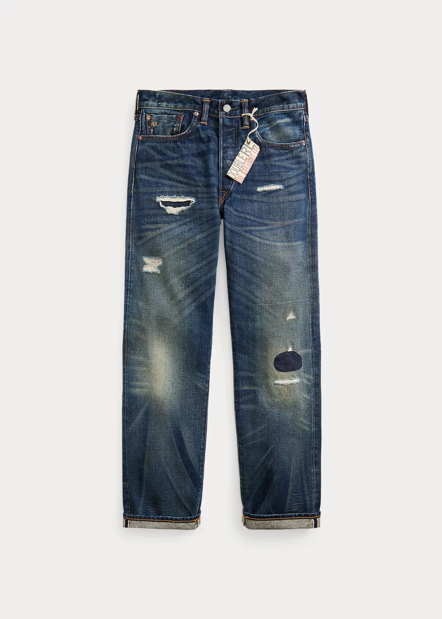 Made in America from 13.75 oz. Japanese selvedge denim. Cut for a straight-leg silhouette. Button-fly construction. Hand-repaired with contrasting twill and distressed. Sanforized® to reduce shrinkage. DETAILS - Straight Fit: a regular rise and a straight leg. - Size 32W has a 9.75" rise and a 16.5" leg opening. - Hand-set chain-stitched waistband with inserted belt loops for added durability. Button fly with our signature buttoned closure ensures a consistent fit through years of wear. - American-made buttons, rivets, and washer burrs. Five-pocket styling. “RRL” embroidery at the selvedge coin pocket. - Roughout suede “RRL”-debossed logo label at the back right waist. - Shell: 100% cotton. Patch: 100% leather. - Machine washable. For best results, wear 90 days without washing. - Made in USA with imported components. - Dyed with indigo, which may rub off onto fabrics, leather, and upholstery. - Style Number: 648471