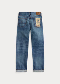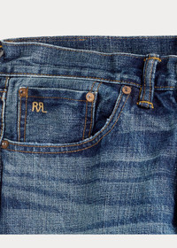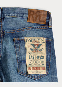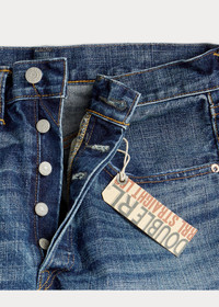 Made in America with Tennessee-grown cotton. Yarn is ring-spun and rope-dyed in Japan using true indigo. Woven on vintage shuttle looms in Japan to create custom 15.92 oz. right-hand twill. Selvedge construction is inspired by ’30s denim. Hand-finished in a process that involves up to 50 individual steps using specialized tools and techniques. DETAILS - Straight Fit: a regular rise and a straight leg. - Size 32W has a 9.75" rise and a 16.5" leg opening. - Hand-set chain-stitched waistband with inserted belt loops for added durability. Button fly with our signature buttoned closure ensures a consistent fit through years of wear. - American-made buttons, rivets, and washer burrs. Five-pocket styling. "RRL" embroidery at the selvedge coin pocket. Twill pocket lining. - Leather "RRL"-debossed logo label at the back right waist. - Shell: 100% cotton. Patch: 100% leather. - Machine washable. For best results, wear 90 days without washing. Made in USA with imported components. - Dyed with indigo, which may rub off onto fabrics, leather and upholstery. - Model is 6'1" (185 cm) and wears a size 32W x 32L. - Style Number: 538582