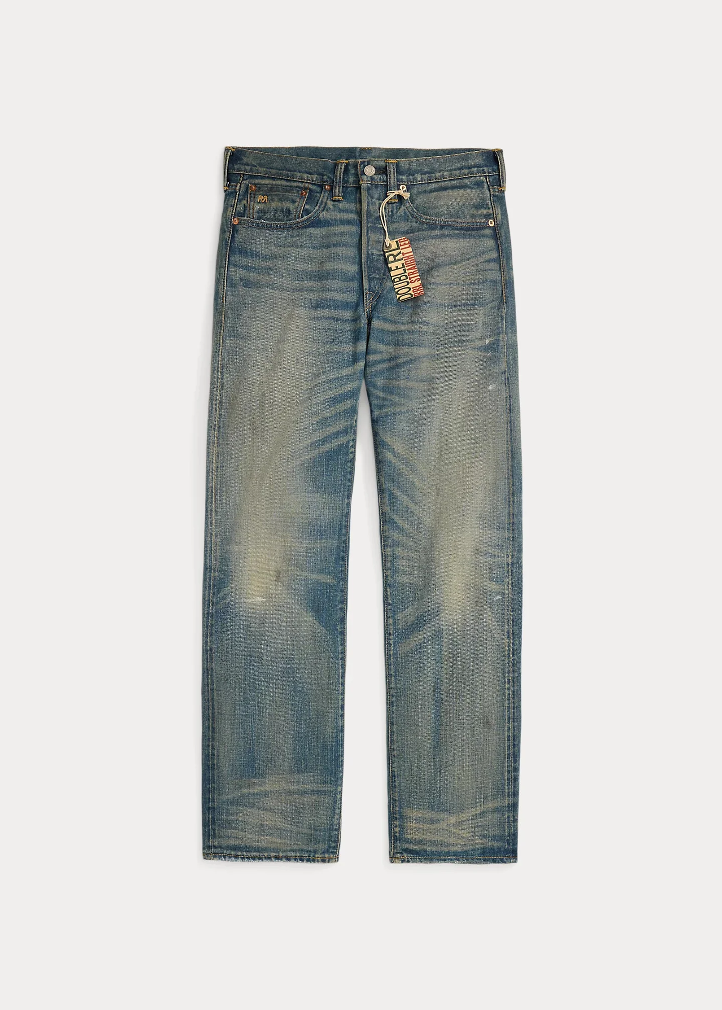 Straight-fitting jeans made in America with Ridgway twill, Double RL’s signature left-hand-twill denim. 13.7 oz. selvedge fabric is shuttle-woven in Japan. Turquoise cast is inspired by 1950s American denim. Distressing and pigments are applied by hand. Button fly. Sanforized® to minimize shrinkage. DETAILS - Straight Fit: a regular rise and a straight leg. - Size 32W has a 9.75" rise and a 16.5" leg opening. - Hand-set, chain-stitched waistband with inserted belt loops for added durability. Button fly with our signature buttoned closure ensures a consistent fit through years of wear. - American-made buttons, rivets, and washer burrs. Five-pocket styling. “RRL” embroidery at the selvedge coin pocket. Heavy twill pocket lining. - Roughout suede “RRL”-debossed logo label at the back right waist. - Shell: 100% cotton. Patch: 100% leather. Machine washable. For best results, wear 90 days without washing. Made in USA of imported components. - By choosing our cotton products, you're supporting our investment in the Better Cotton™ mission to help cotton communities survive and thrive, while protecting and restoring the environment. - This product is sourced via a system of mass balance and therefore may not contain Better Cotton™. Visit bettercotton.org/massbalance for more information about mass balance. - Dyed with indigo, which may rub off onto fabrics, leather, and upholstery. - Style Number: 100041722