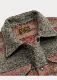 Classic work jacket model made from double-knit birdseye jacquard. Striped pattern and color palette inspired by a vintage equestrian blanket. Woven reinforcements at the interior. Chamois lining at the hand-warmer pockets. Signature snaps with an antiqued-brass finish. DETAILS - Size medium has a 28.25" front body length, a 27.25" back body length, an 18" shoulder, a 45.5" chest, and a 34.75" sleeve length. Sleeve length is taken from the center back of the neck. - Straight collar. Snapped placket. Metal snaps custom-developed with a “Double RL Ralph Lauren Manhattan N.Y.” logo. - Long sleeves with snapped barrel cuffs. - Two chest snapped pockets. Two hand-warmer pockets with chamois lining. - Woven reinforcements at the interior. - 79% wool, 21% polyester (exclusive of trim). - Dry clean. - Imported. - Style Number: 100062168