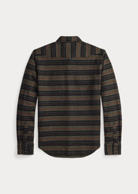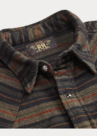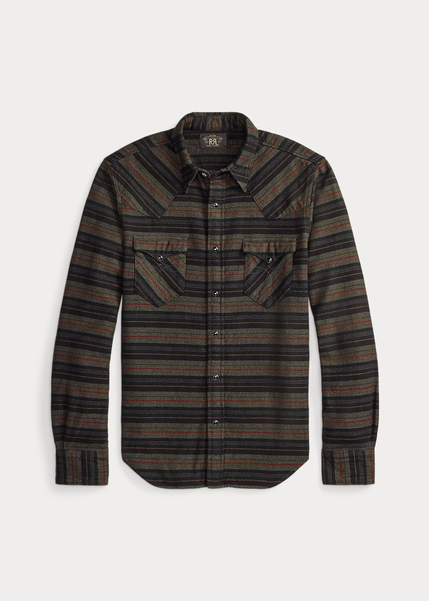 Slim-fitting shirt made with yarn-dyed striped twill. Cotton fabric has a soft drape. Western-style front and back yokes. Metal button at the collar. DETAILS - Western Fit: Double RL’s slimmest shirt silhouette. Cut trim through the body and the sleeves. - Size medium has a 29.25" back body length, an 18.25" shoulder, a 44.25" chest, and a 34.75" sleeve length. Sleeve length is taken from the center back of the neck. - Straight collar with a metal button at the front. Snapped placket. Western-style front and back yokes. - Long sleeves with snapped barrel cuffs. - Two chest snapped pockets. - 100% cotton. - Machine washable. - Imported. - Style Number: 100078200