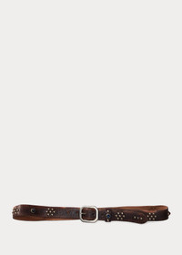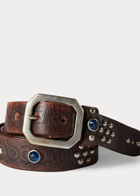 Distressed leather belt. Embossed with a Southwestern-inspired pattern. Embellished with specially corroded brass studs and glass stones. DETAILS - Single-prong brass buckle. - 1¼" wide. - Leather. - Made in Italy. Style Number: 264220