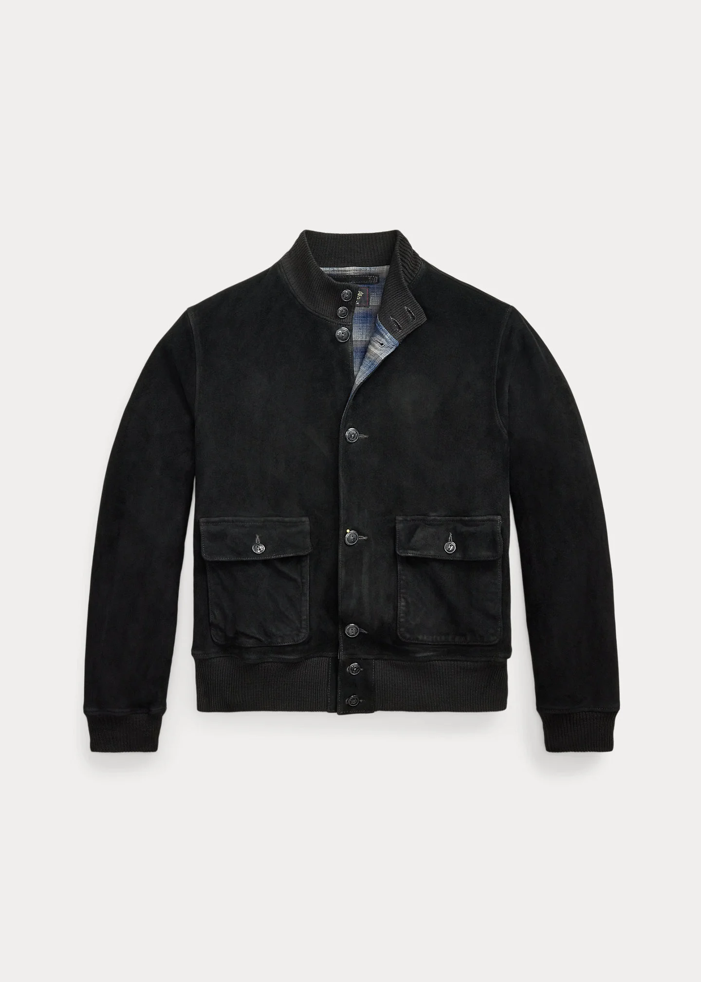 Classic bomber jacket made from lightweight, supple suede. Ribbed collar, cuffs, and hem. Yarn-dyed plaid cotton lining at the body. Corozo buttons. DETAILS - Size medium has a 25" front body length, an 18.25" shoulder, a 47" chest, and a 35.5" sleeve length. Sleeve length is taken from the center back of the neck. - Ribbed baseball collar. Buttoned placket. Corozo buttons. - Long sleeves with ribbed cuffs. - Two front waist buttoned pockets. Interior left waist pocket. - Ribbed hem. Fully lined. Body is lined with plaid cotton. - Shell: 100% deer suede. Ribbed trim: 51% cotton, 49% wool. Body lining: 100% cotton. Sleeve lining: 51% cupro, 49% cotton. - Spot clean. - Imported. - Due to the natural characteristics of this material, the coloring may rub off onto fabrics and upholstery. - Style Number: 100056657