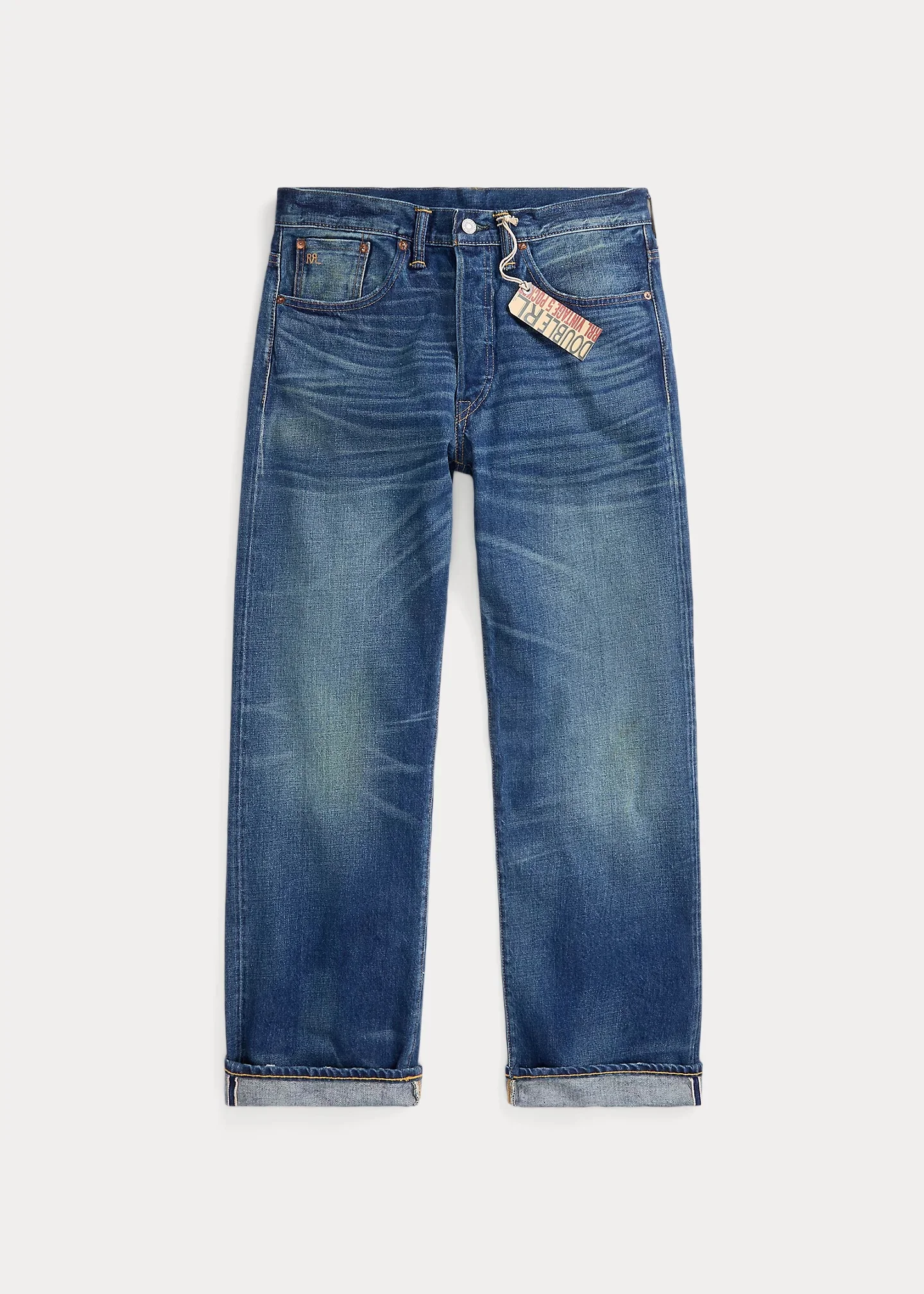 Made in America from 16.25 oz. Japanese selvedge denim. Dyed in our deepest indigo shade with a red-blue cast. Hand-distressed. Sanforized® to reduce shrinkage. DETAILS - Vintage 5-Pocket Fit: the most relaxed silhouette, with the longest rise and a straight leg. - Size 32W has a 10.25" rise and an 18.25" leg opening. - Hand-set, chain-stitched waistband with inserted belt loops for added durability. Button fly with our signature buttoned closure ensures a consistent fit through years of wear. - American-made buttons, copper-tone rivets, and washer burrs. Five-pocket styling. “RRL” embroidery at the selvedge coin pocket. Twill pocket lining. - Roughout suede “RRL”-debossed logo label at the back right waist. - Shell: 100% cotton. Patch: 100% leather. - Machine washable. For best results, wear 90 days without washing. Made in USA with imported components. - Dyed with indigo, which may rub off onto fabrics, leather, and upholstery. - Model is 6'1" (185 cm) and wears a size 32W x 32L. - Style Number: 442985