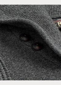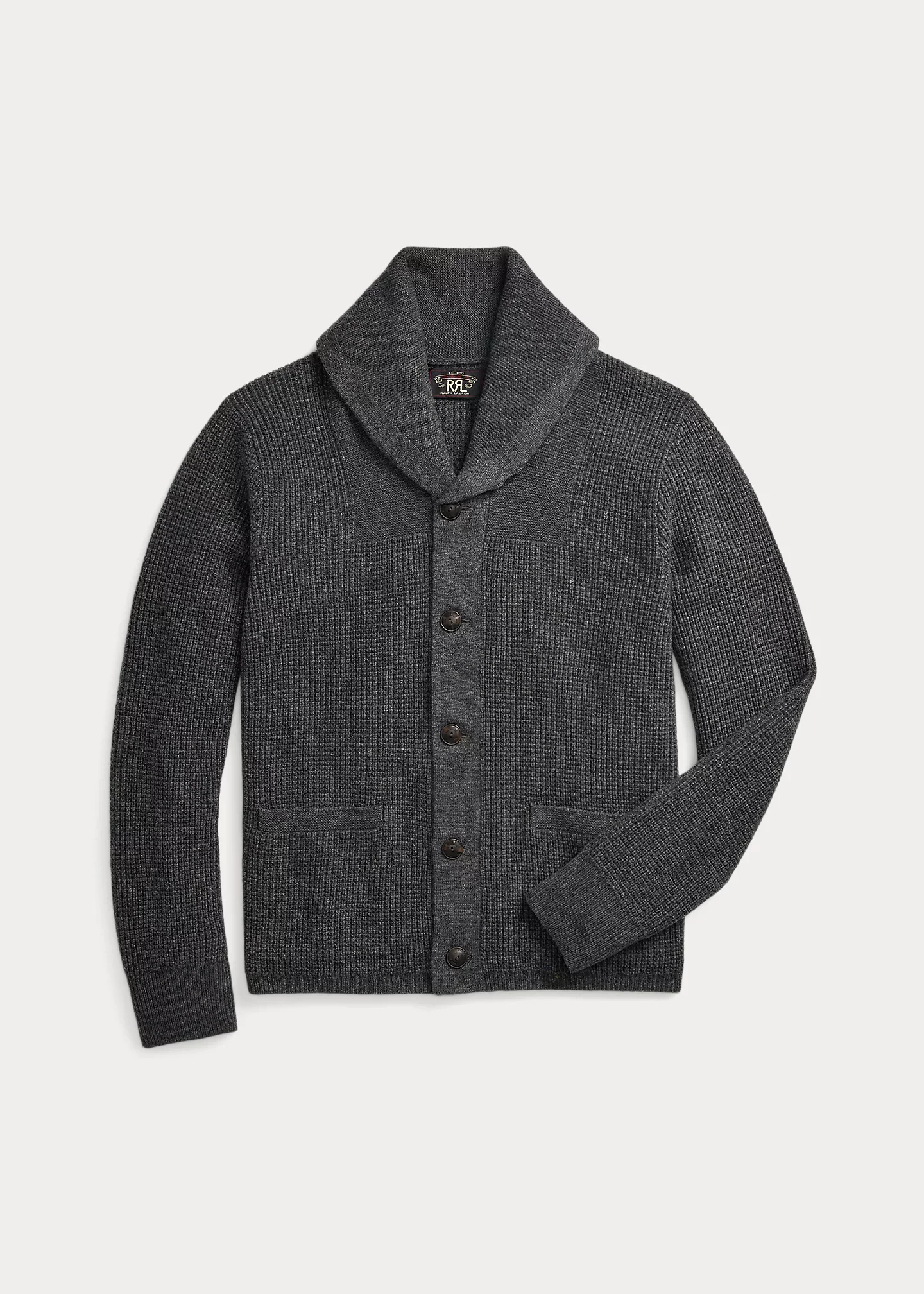 Shawl-collar cardigan made with cashmere yarn. Waffle-knit construction. Ribbed cuffs and hem. Corozo buttons. DETAILS - Size medium has a 25.75" front body length, a 16.25" shoulder, a 40" chest, and a 24.75" sleeve length. - Shawl collar with a two-button closure at the right side. Buttoned placket. Corozo buttons. - Long sleeves with rib-knit cuffs. - Two front waist welt pockets. - Rib-knit hem. - 100% cashmere. - Hand wash. - Imported. - Style Number: 100041327