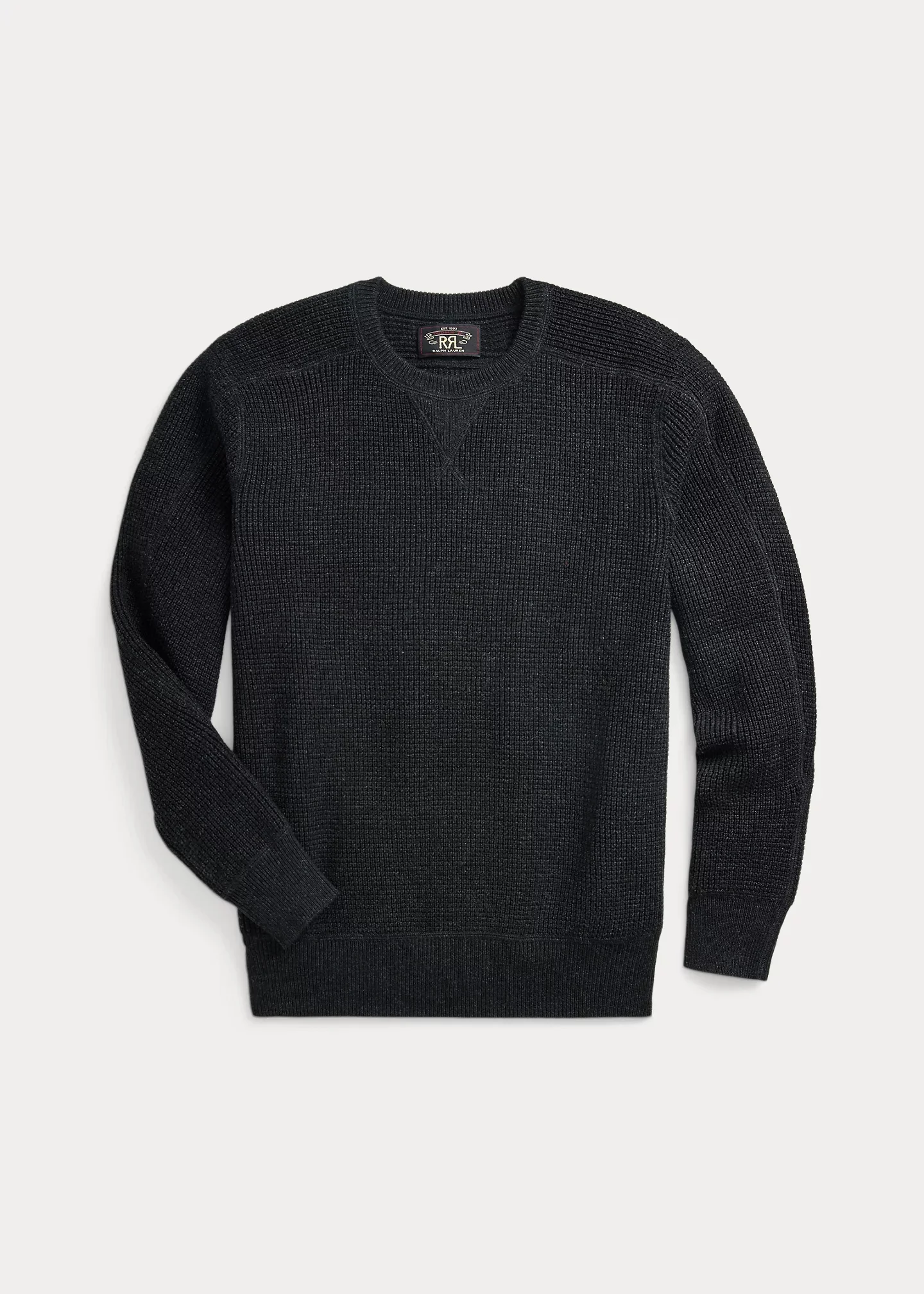 Made with cotton and wool yarns that are pre-twisted for a soft feel and a vintage look. Waffle-knit construction. Crewneck with a V-inset. Ribbed cuffs and hem. DETAILS - Size medium has a 25.75" front body length, a 17" shoulder, a 40" chest, and a 32.75" sleeve length. Sleeve length is taken from the center back of the neck. - Crewneck. Rib-knit V-inset. - Long sleeves with rib-knit cuffs. - Rib-knit hem. - Black colorway: 61% cotton, 39% wool. Dark Olive colorway: 59% cotton, 41% wool. - Hand wash or dry clean. - Imported. - Style Number: 100028156