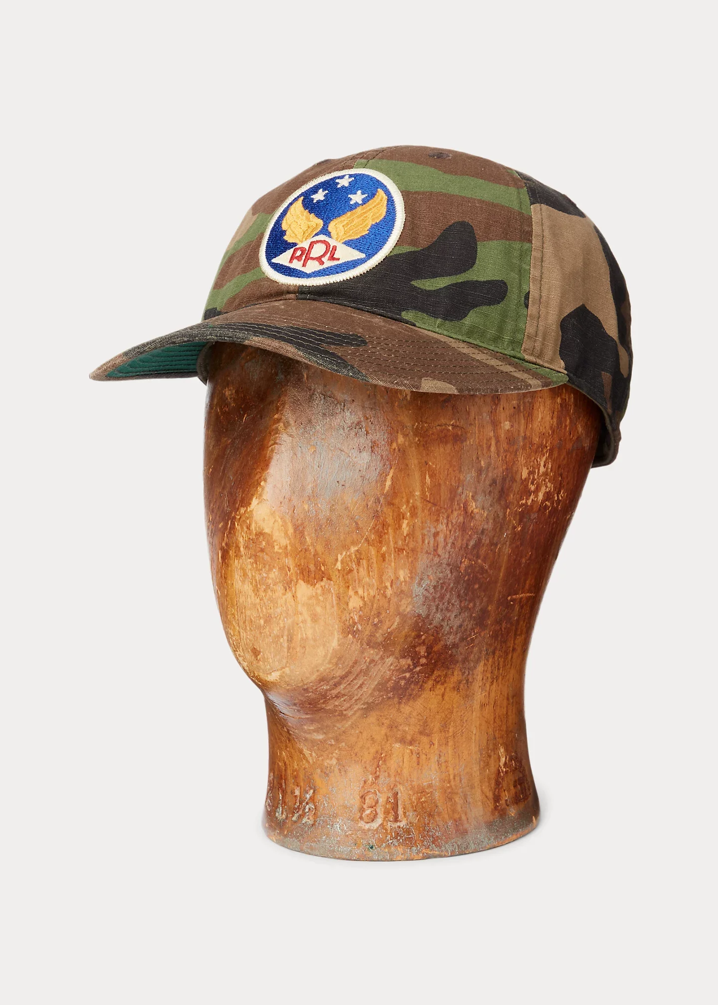 Made from camouflage cotton ripstop. Flight-inspired logo patch at the front. Signature green underbill. Washed for a vintage look. DETAILS - Sewn bill. Signature green underbill. - Six-panel construction. - Ventilating embroidered eyelets. - “RRL” winged-logo patch at the front. - Adjustable snapped back strap. - Twill sweatband. - 22¾" inner circumference. - 100% cotton. - Dry clean. Imported. Style Number: 607929