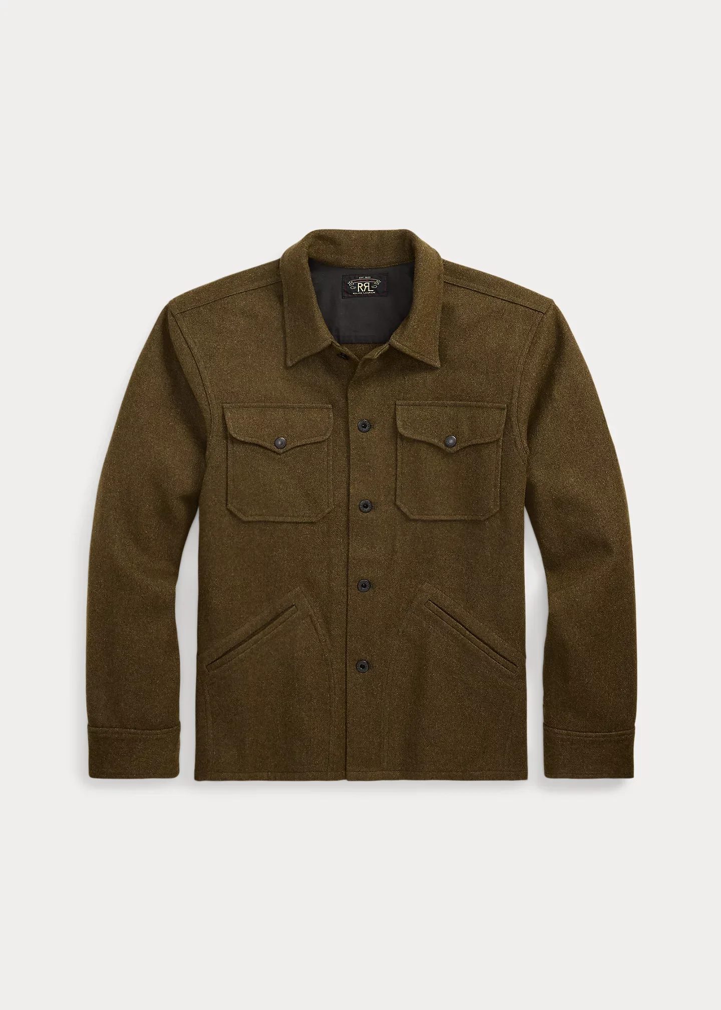 Made with a wool-blend cloth that features a broken-twill weave. Metal buttons with a black-oxidized finish. Lined at the back yoke. DETAILS - Size medium has a 27" back body length, a 19.25" shoulder, a 45" chest, and a 34.75" sleeve length. Sleeve length is taken from the center back of the neck. - Straight collar. Buttoned placket. Metal buttons with a black-oxidized finish. - Long sleeves with buttoned barrel cuffs. - Two chest snapped pockets. Two front waist angled pockets. - Lined at the back yoke with twill. - Shell: 60% wool, 40% viscose. Yoke lining: 100% cotton. - Dry clean. - Imported. - Style Number: 100059668