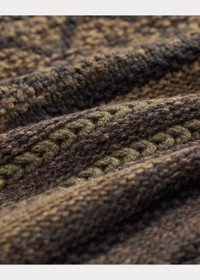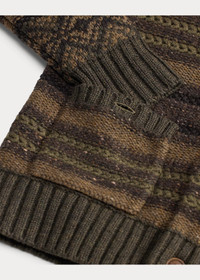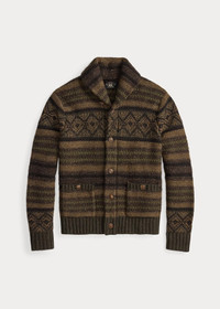Shawl-collar cardigan made with thick-gauge wool and cotton yarns. Inspired by an equestrian blanket from the 1940s. Fair Isle detailing and striped patterns. Knit utilizing a variety of stitches. Ribbed cuffs and hem. Genuine horn buttons. DETAILS - Size medium has a 26" front body length, a 17" shoulder, a 41" chest, and a 24.75" sleeve length. - Shawl collar with a two-button closure at the right side. Five-button placket. Genuine horn buttons. - Long sleeves with rib-knit cuffs. - Two front waist buttoned pockets. - Rib-knit hem. - 87% wool, 13% cotton. - Hand wash or dry clean. - Imported. - Style Number: 100065509