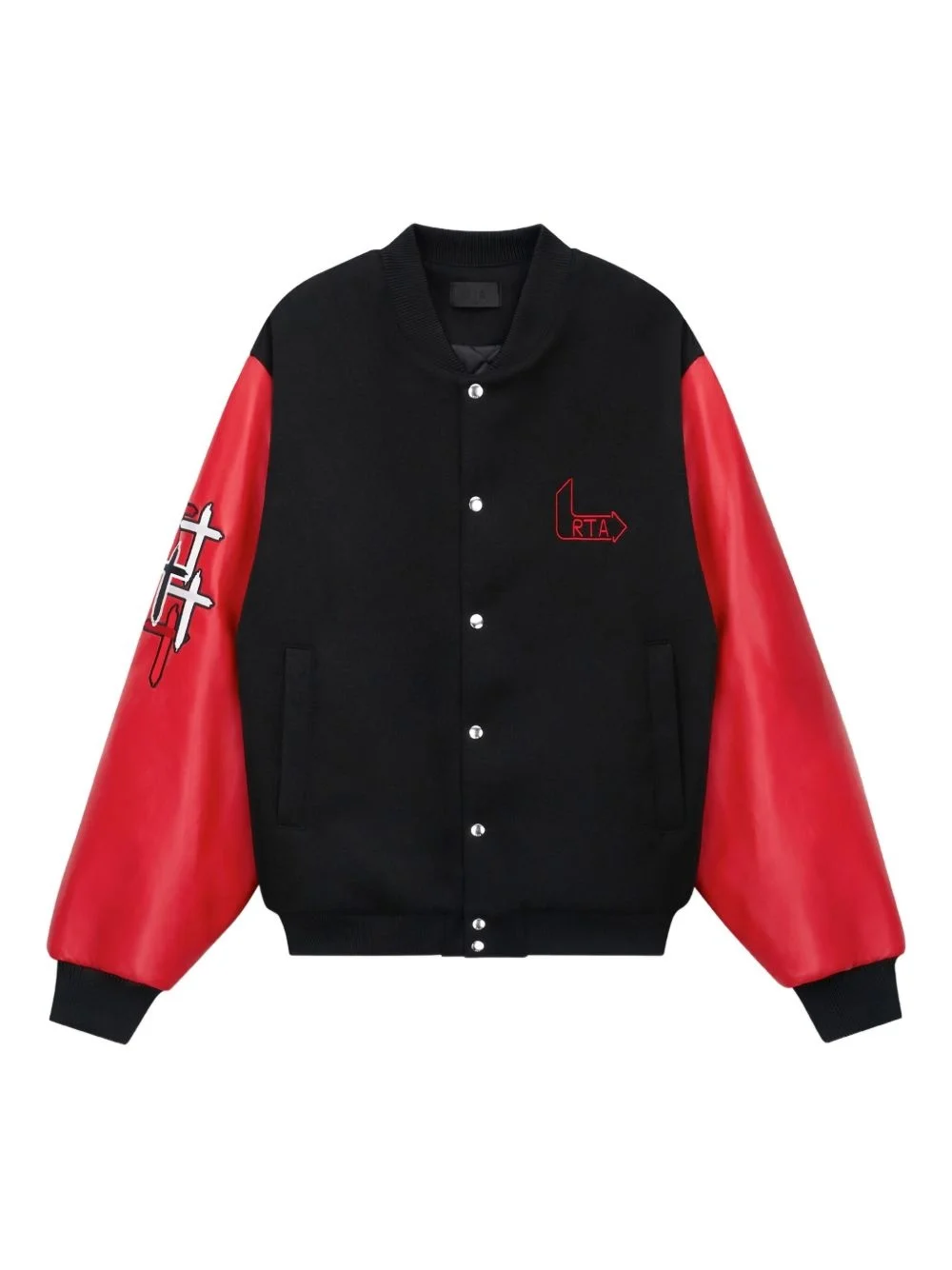 Marty flame-print jacket Highlights - Black - Red leather sleeves - Flame logo embroidery - Button fastening - Graphic print sleeves - Embroidered logo Imported Composition Artificial Leather 100%, Polyester 60%, Wool 20%, Acrylic 20% Washing instructions Read Manufacturer Guidelines