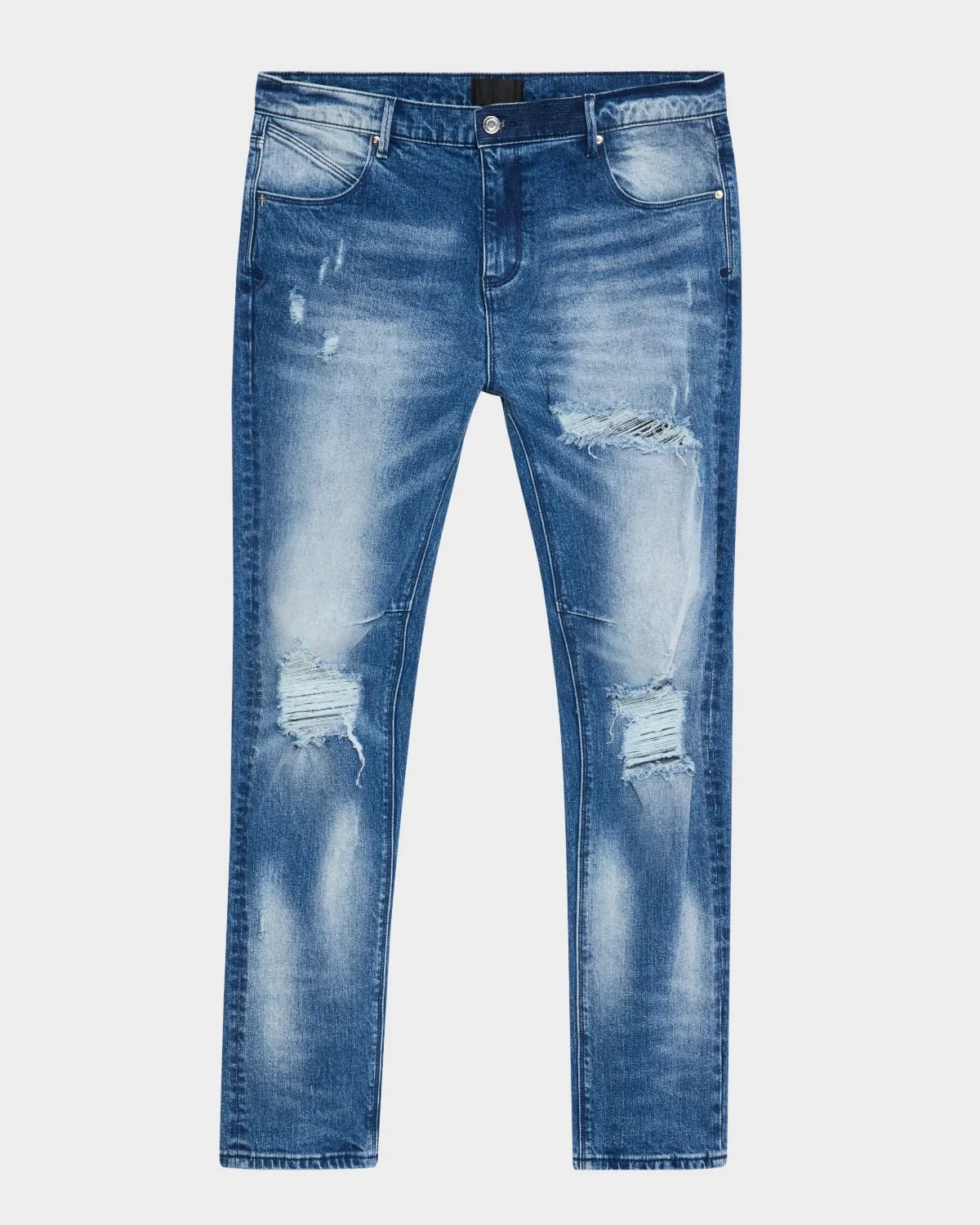 - RTA "Clayton" jeans with heavy fading and distressing - Regular rise - Five-pocket style - Signature pintuck dagger seams on back legs - Articulated knees - Skinny legs - Cotton/spandex - Machine wash cold - Imported