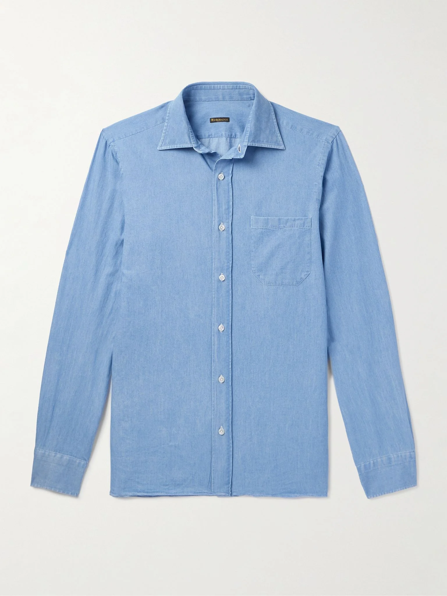 Rubinacci's designs capture the relaxed refinement of Neapolitan style. Tailored from lightweight cotton-chambray, this shirt has a chest pocket and fastens with a row of lustrous mother-of-pearl buttons. Turn up the cuffs to enhance the laid-back feel. Size & Fit - Fits true to size. Take your normal size - Designed for a relaxed fit - Lightweight, non-stretchy fabric - Model is shown wearing a M - Model measures: chest 38"/ 96cm, height 6'1"/ 185cm Details & Care - Light-blue cotton-chambray - Button fastenings - 100% cotton - Machine wash - Mother-of-pearl: Australia