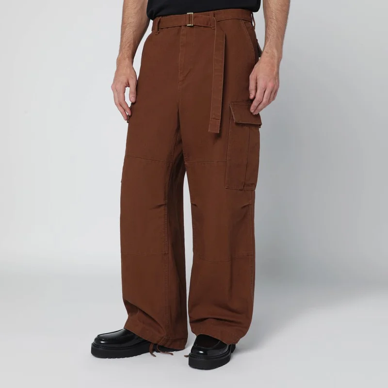 Carhartt WIP cargo trousers made in collaboration with Sacai in beige cotton, featuring front zip and button closure, belt loops, two side pockets, two back flap pockets, two cargo pockets (one with logo patch), adjustable waistband, and drawstring cuffs.