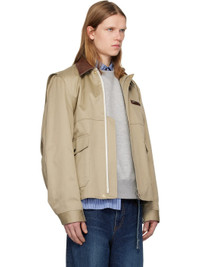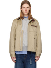 Cotton twill jacket. · Leather spread collar · Zip closure with press-stud placket · Zip pocket at chest · Flap and zip pockets at waist · Zip expansion panel at cuffs · Press-stud barrel cuffs · Twin pleats at back yoke · Full cupro satin lining Supplier color: Beige Body: 100% cotton. Trim: 100% leather. Lining: 100% cupro. Made in Japan 261445M180021
