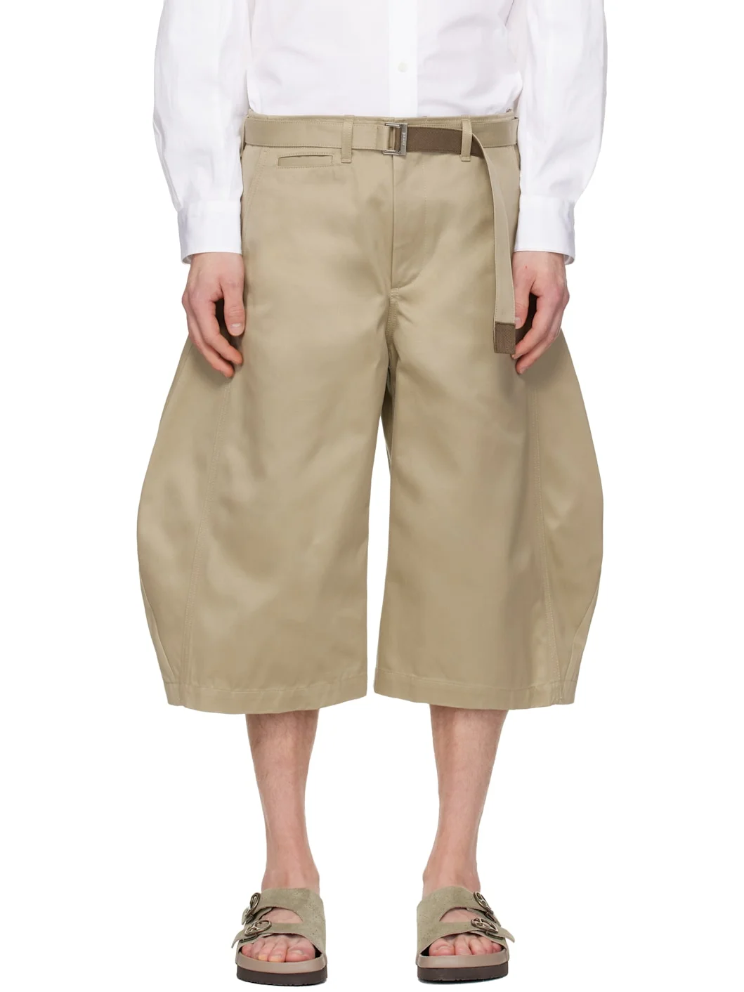 Cotton twill trousers. · Belt loops and detachable cinch belt at waistband · Five-pocket styling · Zip fly · Cropped leg · Gusset at outseams Supplier color: Beige 100% cotton. Made in Japan 261445M191013