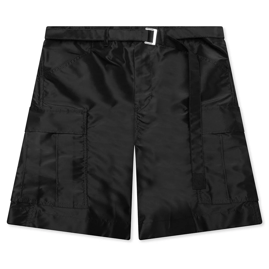 Luxury brand Sacai introduces the Belted Nylon Bermuda Cargo Shorts in its latest collection. This garment is composed of 100% nylon and has an inner lining for extra support. The cargo-style pockets and adjustable belt add dimension. Some finishing touches include additional straps at the back pockets and additional side-seam pockets. - 100% Nylon - Belted waistband - Cargo pockets - Back pocket straps - Side-seam pockets - Style No: 25-03616M-001