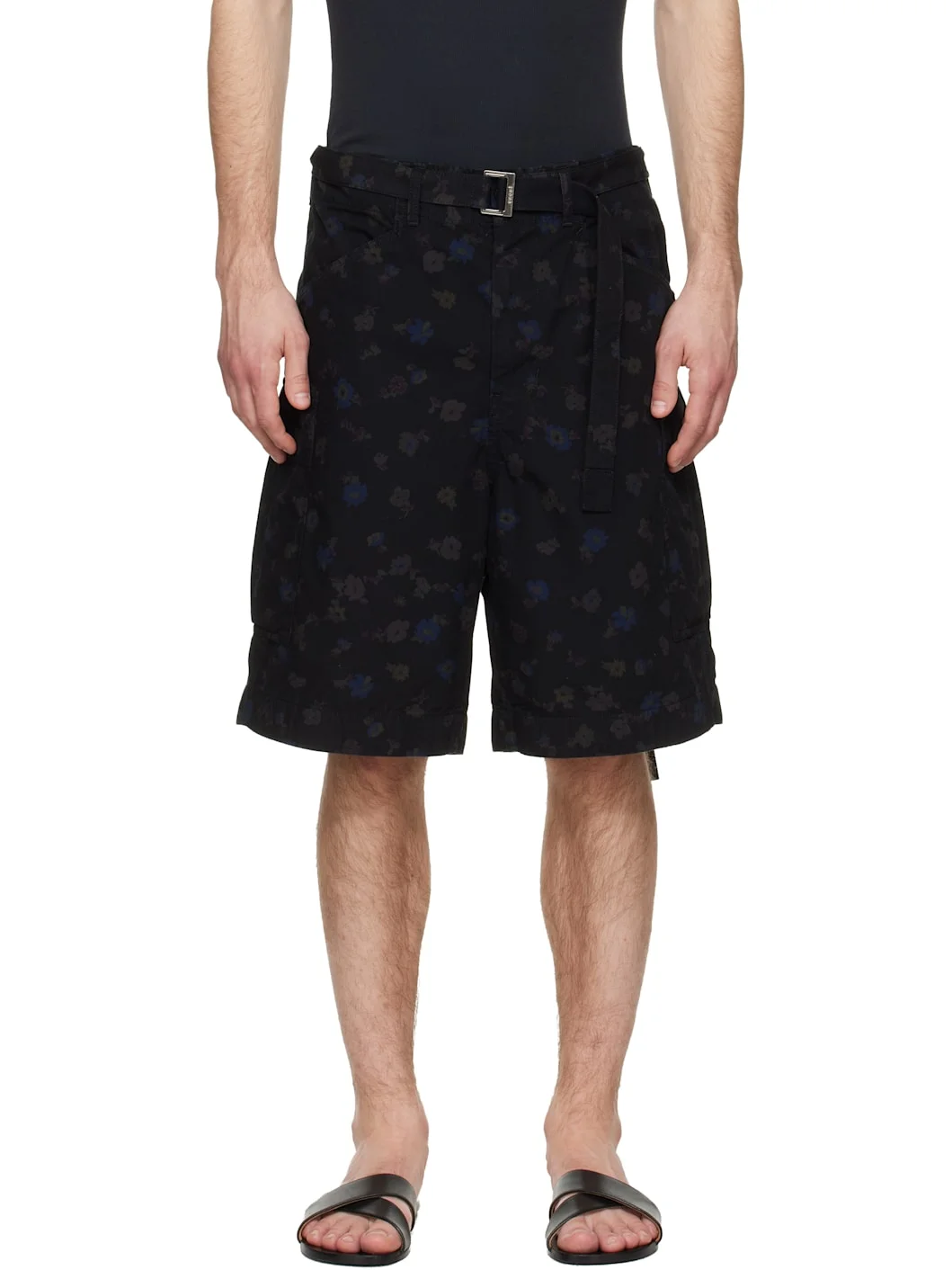 Cotton ripstop cargo shorts. · Floral pattern printed throughout · Belt loops and detachable cinch belt at waistband · Four-pocket styling · Zip fly · Cargo pocket at outseams · Webbing strap at back legs Supplier color: Black 100% cotton. Made in Japan 261445M193007