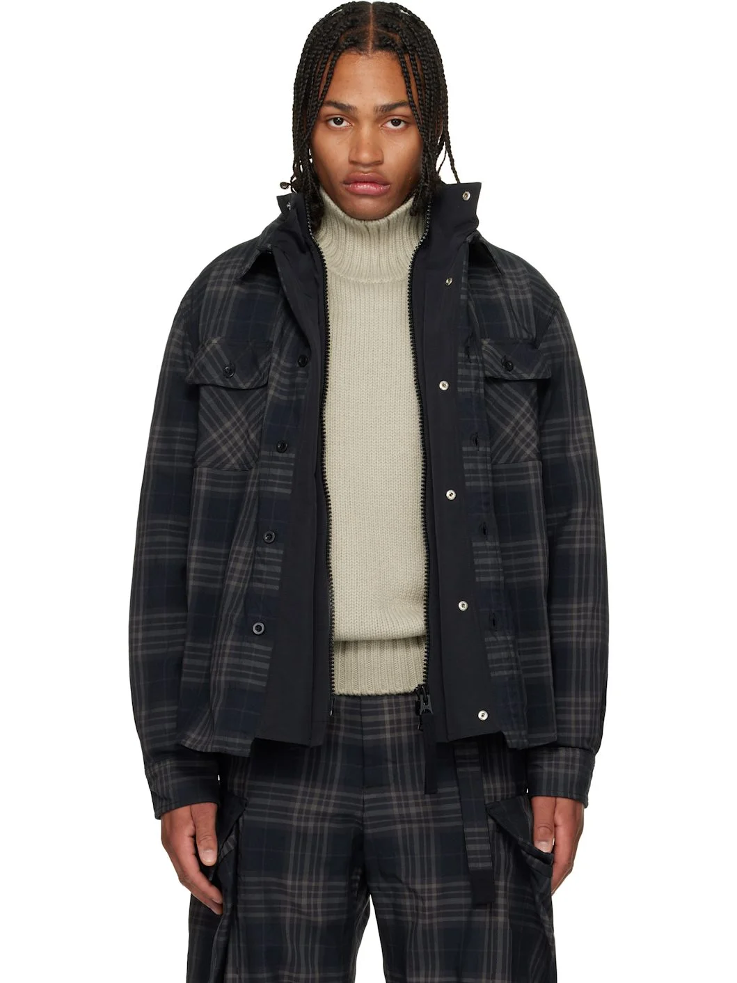 Twill shirt. · Check pattern throughout · Layered stand and spread collars · Two-way zip closure with button and press-stud placket · Flap pockets at chest · Shirttail hem · Buttoned barrel cuffs · Box pleat at back yoke Supplier color: Black Body: 100% polyester. Trim: 60% cotton, 40% nylon. Made in Japan 252445M192007
