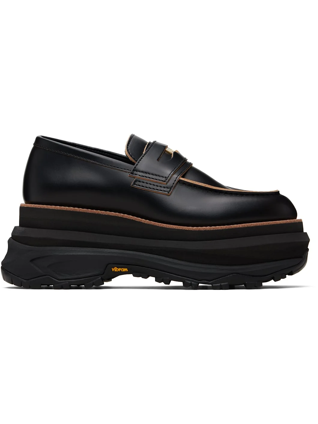 Buffed leather loafers. · Moc toe · Strap with logo hardware vamp · Buffed calfskin lining · Topstitching at welt · Foam rubber platform midsole · Treaded Vibram® rubber sole · Platform: H3" Supplier color: Black Upper: leather. Sole: rubber. Made in Japan 261445M231002